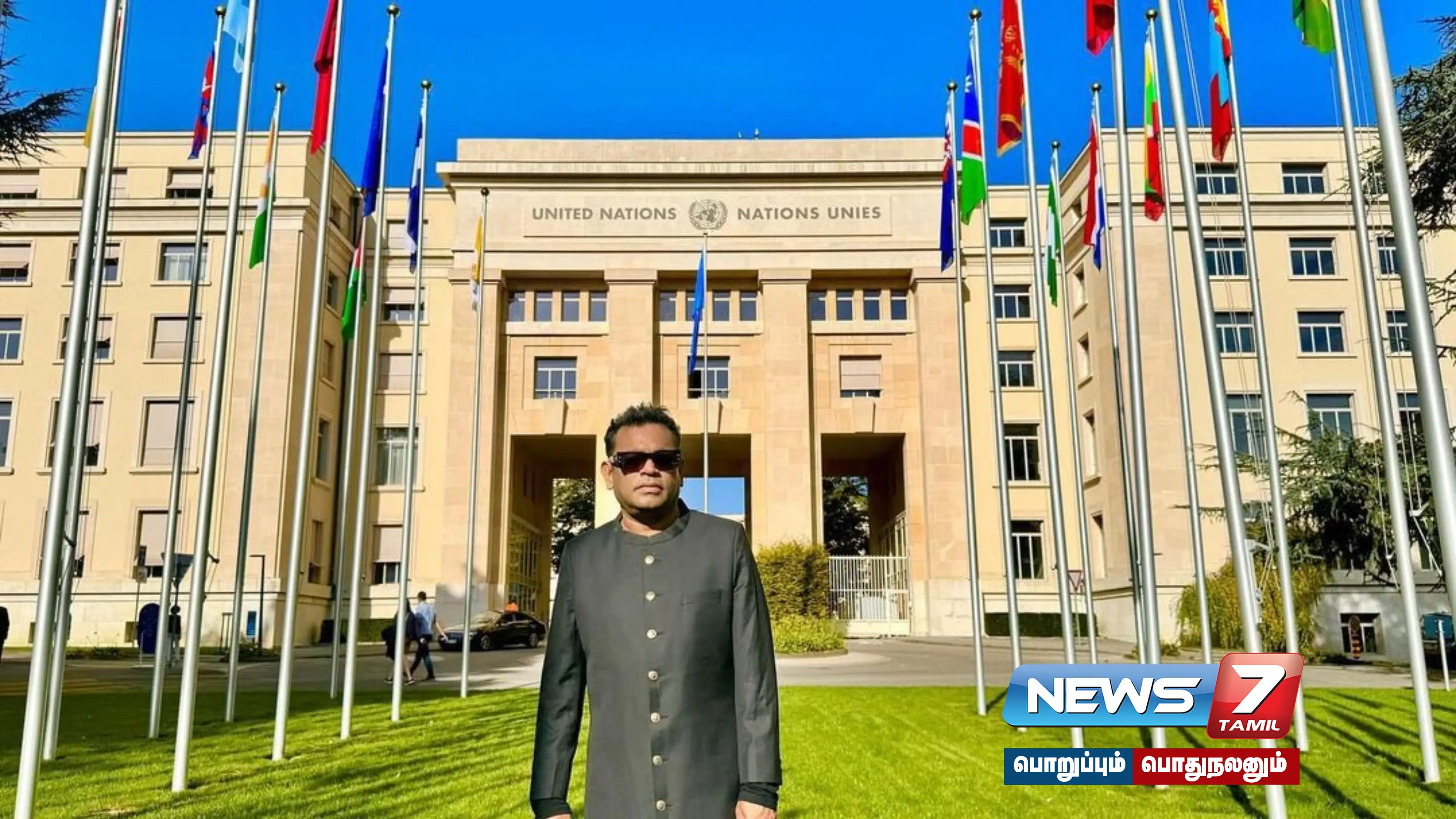 இந்நிலையில், ஸ்விட்சர்லாந்து நாட்டில் உள்ள ஐ.நா. சபையின் தலைமையகத்திற்கு வெளியே தான் நிற்கும் புகைப்படத்தை ஏ.ஆர்.ரஹ்மான் தனது சமூக ஊடக பக்கங்களில் பகிர்ந்துள்ளார். ஆனால், எதற்காக ஐ.நா. அவைக்கு சென்றார் என்ற தகவலை அவரது சமூக வலைதள பக்கங்களில் பகிரவில்லை.