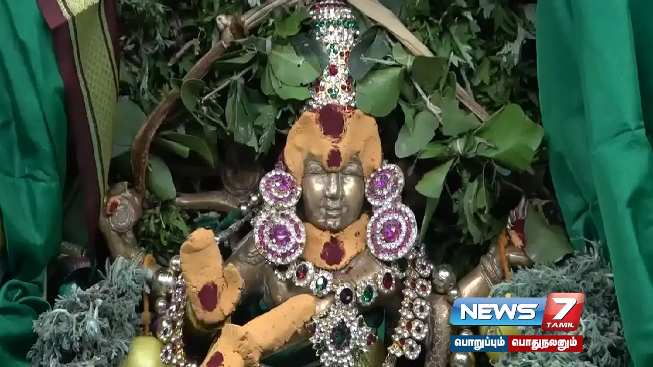 மகாவிஷ்ணு ரூபமாக, பச்சை மலர்களால் அலங்கரிக்கப்பட்ட பூஞ்சப்பரத்தில் பச்சை