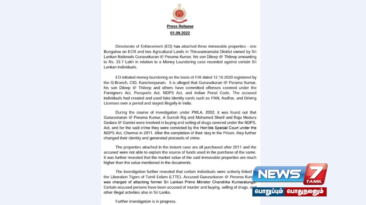 இதனைத் தொடர்ந்து அவர்கள் அனைவரும் கைது செய்யப்பட்டனர். மேலும் க்யூ பிரிவு வழக்கின் அடிப்படையில் அமலாக்க துறையினர் வழக்கு பதிவு செய்து, இவர்களுக்கு சொந்தமான கிழக்கு கடற்கரையில் உள்ள ஒரு சொகுசுபங்களா மற்றும் திருவண்ணாமலை உள்ள இரண்டு விவசாய நிலங்கள் என மொத்தம் 33 லட்சம் மதிப்பிலான சொத்துக்களை முடக்கி உள்ளனர். இந்த சொத்துக்கள் அனைத்துமே கடந்த 2011 ஆம் ஆண்டுக்கு பின்னர் வாங்கப்பட்ட சொத்துக்கள் எனவும் இதற்கு முறையான வருமான விளக்கங்கள் அளிக்காததால் இவற்றை பறிமுதல் செய்துள்ளதாக அமலாக்க துறையினர் தெரிவித்துள்ளனர்.
