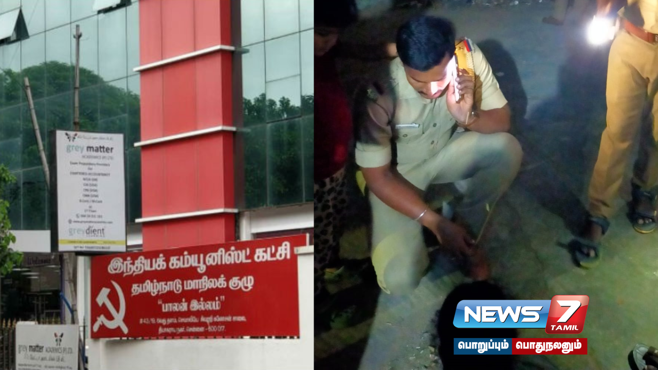 சென்னை தியாகராய நகர் பகுதியில் அமைந்துள்ள இந்திய கம்யூனிஸ்ட் கட்சியின் தலைமை அலுவலகமான பாலன் இல்லத்தில் நேற்று இரவு அடையாளம் தெரியாத நபர்கள் சிலர் அலுவலகத்தின் வளாகத்திற்குள் 6-க்கும் மேற்பட்ட பீர் பாட்டில்கள் மற்றும் கற்களை வீசி தாக்குதல் நடத்தினர்.