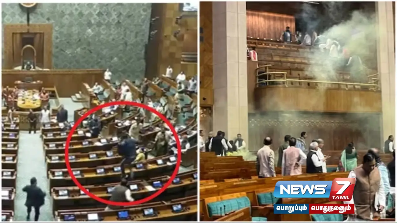 இந்நிலையில், தாக்குதல் தொடர்பான வீடியோ வெளியாகி பெரும் பரபரப்பை ஏற்படுத்தியுள்ளது. அந்த வீடியோவில், பார்வையாளர் மாடத்திலிருந்து 2 பேர் திடீரென்று மக்களவை அரங்குக்குள் குதித்தனர். இவர்கள் தவறி விழுந்ததாக முதலில் எம்பிக்கள் நினைத்த நிலையில் அவர்கள் வேகமாக எம்பிக்கள் அமர்ந்திருக்கும் மேஜையில் ஏறி முன்னோக்கி ஓடினர்.