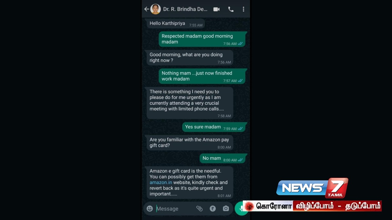 தமிழ்நாட்டில் சில காலமாக உயர் அதிகாரிகளின் பெயரில் போலி கணக்கு தொடங்கப்பட்டு அதன் மூலம், பணம் பறிக்கும் செயலில் ஒரு சிலர் ஈடுபட்டு வருகின்றனர். அந்த வரிசையில் தமிழ்நாடு தோட்டக்கலைத் துறையின் இயக்குநர் பிருந்தா தேவி ஐ.ஏ.எஸ்.-யின் பெயரில் போலி வாட்ஸ்அப் அக்கவுண்ட் தொடங்கி, அதிலிருந்து அவருடைய நண்பர்களிடம் பேசி, பணம் பறிக்கும் செயல் அண்மைக்காலமாக நடைபெற்றுள்ளது.