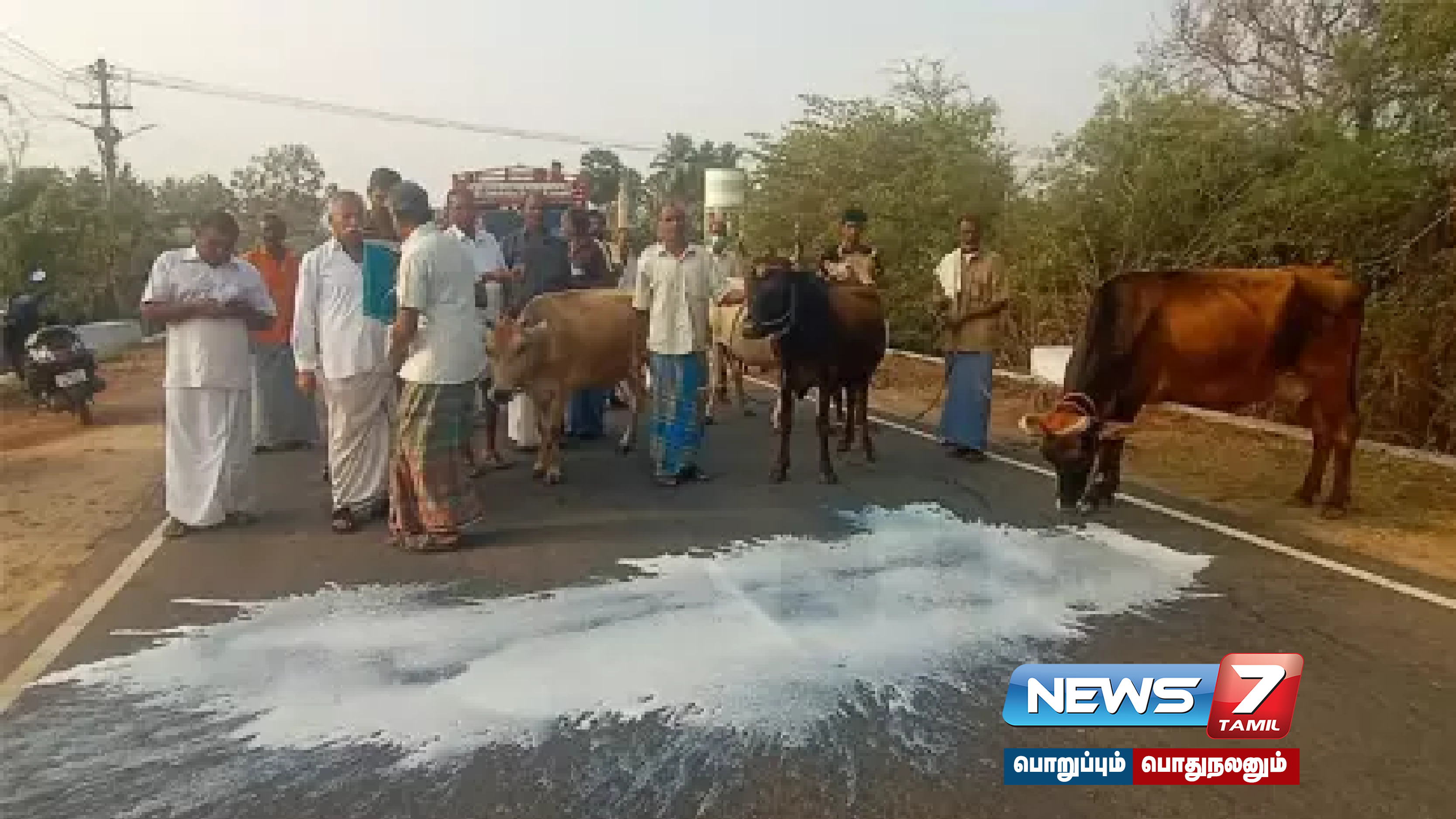 இதே போல், ஈரோடு, நசியனூர், ராயபாளையம் பால் உற்பத்தியாளர்கள் கூட்டுறவு சங்கத்தின் முன்பு தமிழ்நாடு பால் உற்பத்தியாளர்கள் நலச்சங்கத்தின் மாநில பொருளாளர் ராமசாமி தலைமையில் பால் உற்பத்தியாளர்கள் கறவை மாடுகளுடன் சாலை மறியல் போராட்டத்திலும், பாலை சாலையில் கொட்டியும் போராட்டத்தில் ஈடுபட்டு வருகின்றனர்.