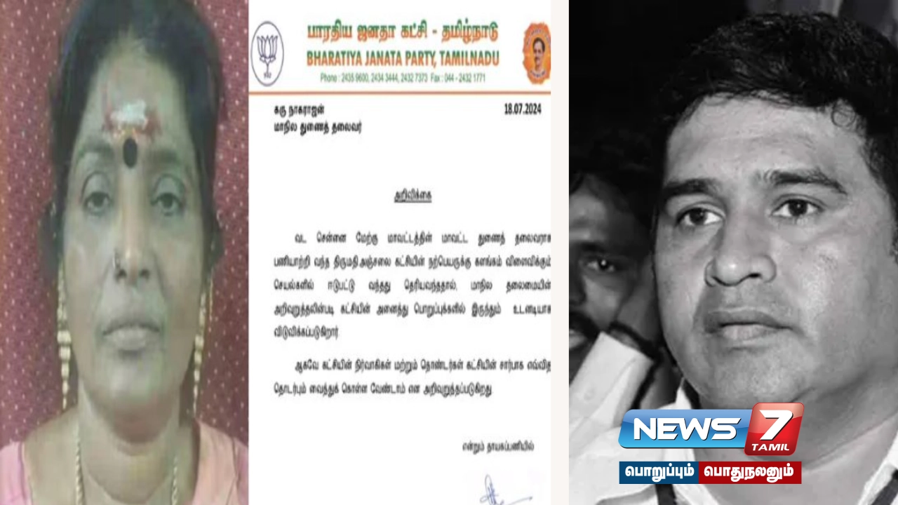 ஆம்ஸ்ட்ராங் கொலை வழக்கில் தேடப்பட்டு வரும் பாஜக நிர்வாகி அஞ்சலை கட்சியிலிருந்து நீக்கம் செய்துள்ளதாக தமிழக பாஜக அதிகாரப்பூர்வமாக அறிவித்துள்ளது.
