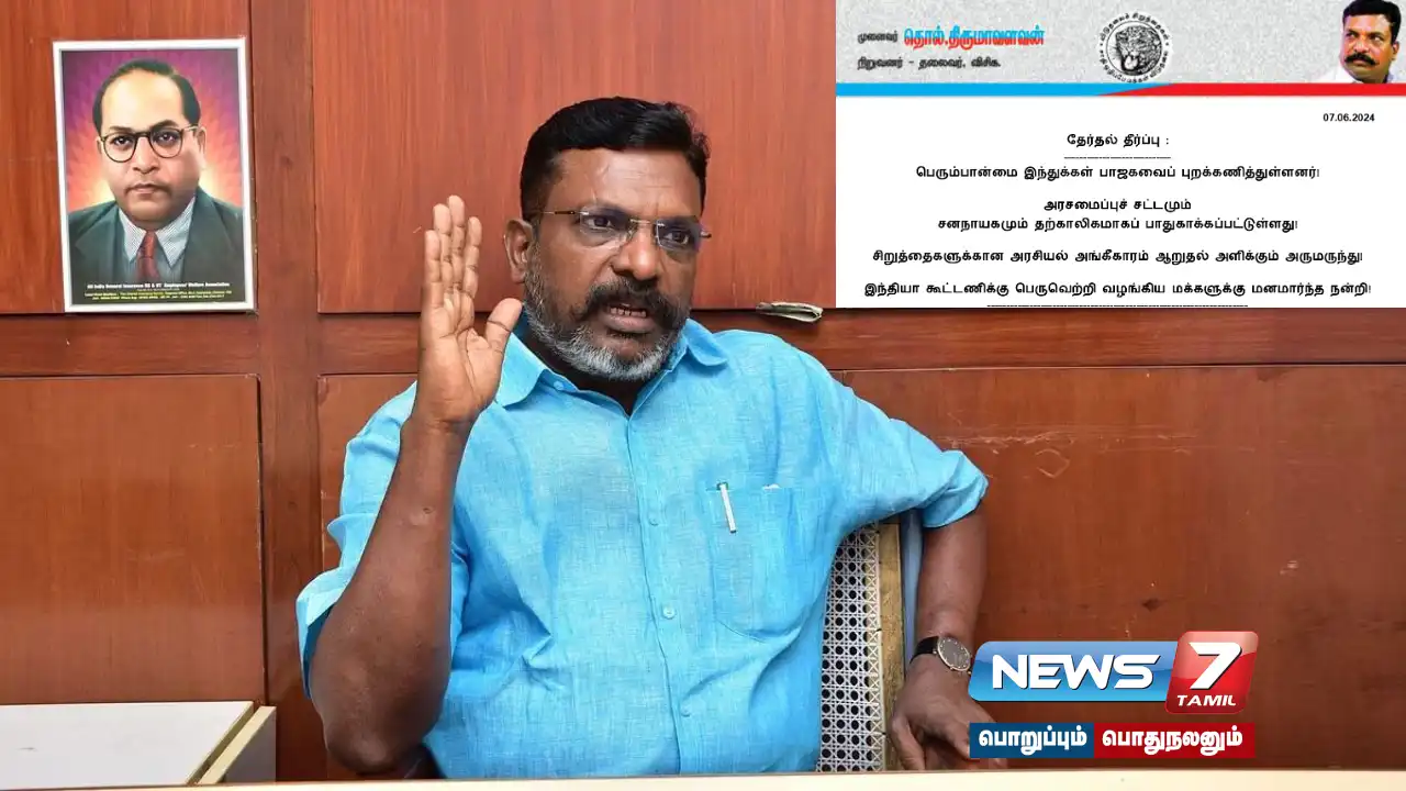 “பெரும்பான்மை இந்துக்கள் பாஜகவைப் புறக்கணித்துள்ளனர்! அரசமைப்புச் சட்டமும் சனநாயகமும் தற்காலிகமாகப் பாதுகாக்கப்பட்டுள்ளது! சிறுத்தைகளுக்கான அரசியல் அங்கீகாரம் ஆறுதல் அளிக்கும் அருமருந்து! இந்தியா கூட்டணிக்கு பெருவெற்றி வழங்கிய மக்களுக்கு மனமார்ந்த நன்றி!