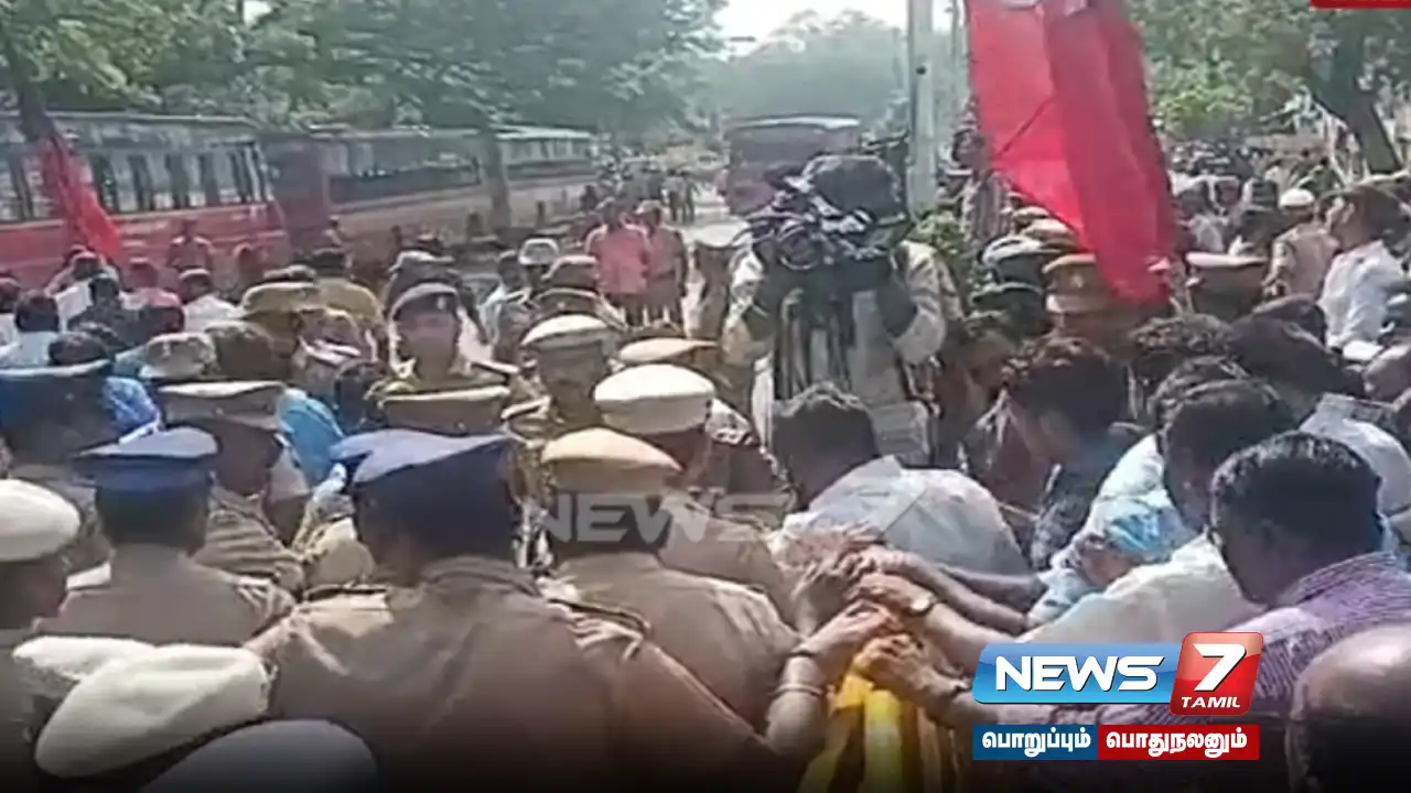 இந்நிலையில் சென்னை பல்லவன் பணிமனை முன் போராட்டத்தில் ஈடுபட்ட சிஐடியு மாநிலத் தலைவர் அ.சவுந்தரராசன் உள்ளிட்டோர் கைது செய்யப்பட்டனர். தடுப்புகளை மீறி சாலை மறியலில் ஈடுபட்டவர்களை காவல்துறையினர் கைது செய்தனர். கைது செய்யப்பட்ட அனைவரும் வாலாஜா சாலையில் உள்ள அண்ணா அரங்கம் அழைத்து செல்லப்பட்டனர்.