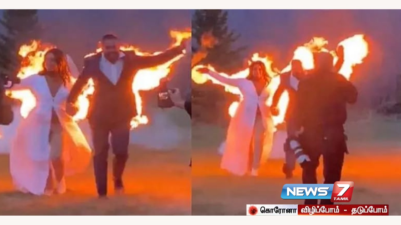 உடலில் தீவைத்துக் கொண்டு சாகச திருமணம் செய்துகொண்ட ஹாலிவுட் ஸ்ட்ண்ட் கலைஞர்களின் வீடியோ சமூக வலைதளங்களில் வைரலாக பரவி வருகிறது.