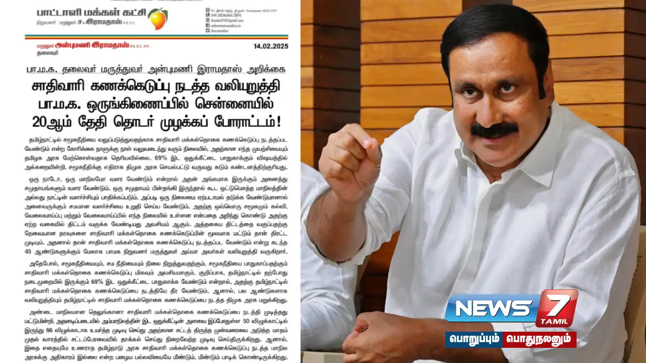 சாதிவாரி கணக்கெடுப்பு நடத்த வலியுறுத்தி பா.ம.க. ஒருங்கிணைப்பில் சென்னையில் 20ஆம் தேதி தொடர் முழக்கப் போராட்டம்!#SocialJustice pic.twitter.com/R3Mc81mwko
