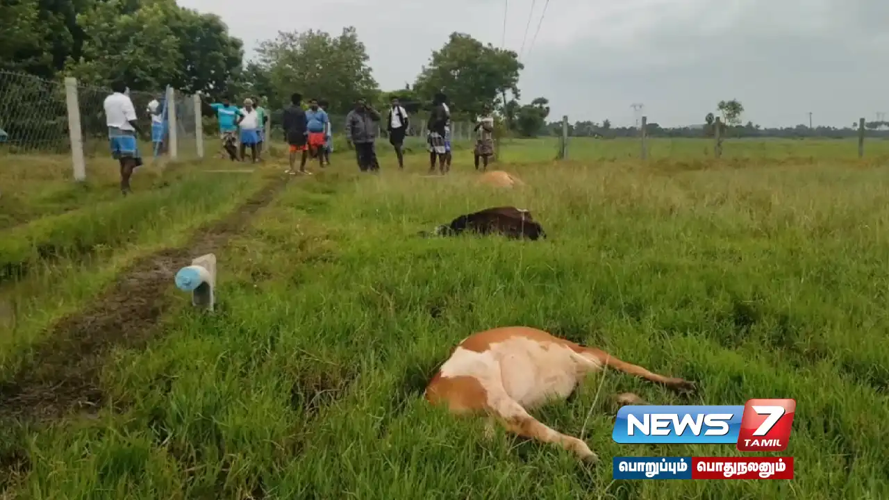செங்கல்பட்டு மாவட்டம், திருவாத்தூர் அருகே மேச்சலுக்கு சென்ற 4 பசுமாடுகள் மின்சாரம் தாக்கியதால் உயிரிழந்தன.