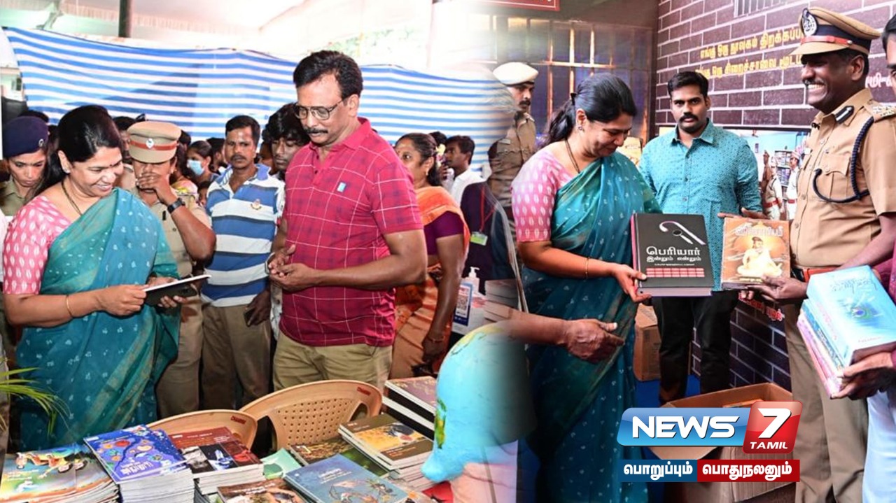 “கூண்டுக்குள் வானம் “ அரங்கை திமுக வின் நாடாளுமன்ற உறுப்பினர் கனிமொழி பார்வையிட்டு சிறைவாசிகள் படிப்பதற்காக 150 புத்தகங்களை தானமாக வழங்கினார்.