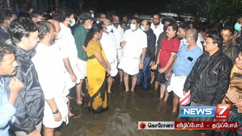 பின்னர் செய்தியாளர்களிடம் பேசிய பழனிசாமி, சென்னை மாநகரமே வெள்ளக்காடாக காட்சியளிக்கிறது, திமுக அரசு சரியான முறையில் திட்டமிடாத காரணத்தால் சாலைகளில் மழைநீர் தேங்கி காணப்படுகிறது. அதிமுக ஆட்சியின்போது மழை துவங்குவதற்கு முன்பே திட்டமிட்டு தண்ணீர் தேங்கும் இடங்களை ஆராய்ந்து முன்னேற்பாடுகள் செய்யப்பட்டது. வானிலை ஆய்வு மையம் ரெட் அலர்ட் அறிவித்திருந்தாலும், திமுக அரசின் மெத்தனப் போக்கின் காரணமாக இந்த நிலை ஏற்பட்டுள்ளது என்று குற்றம்சாட்டினார்.