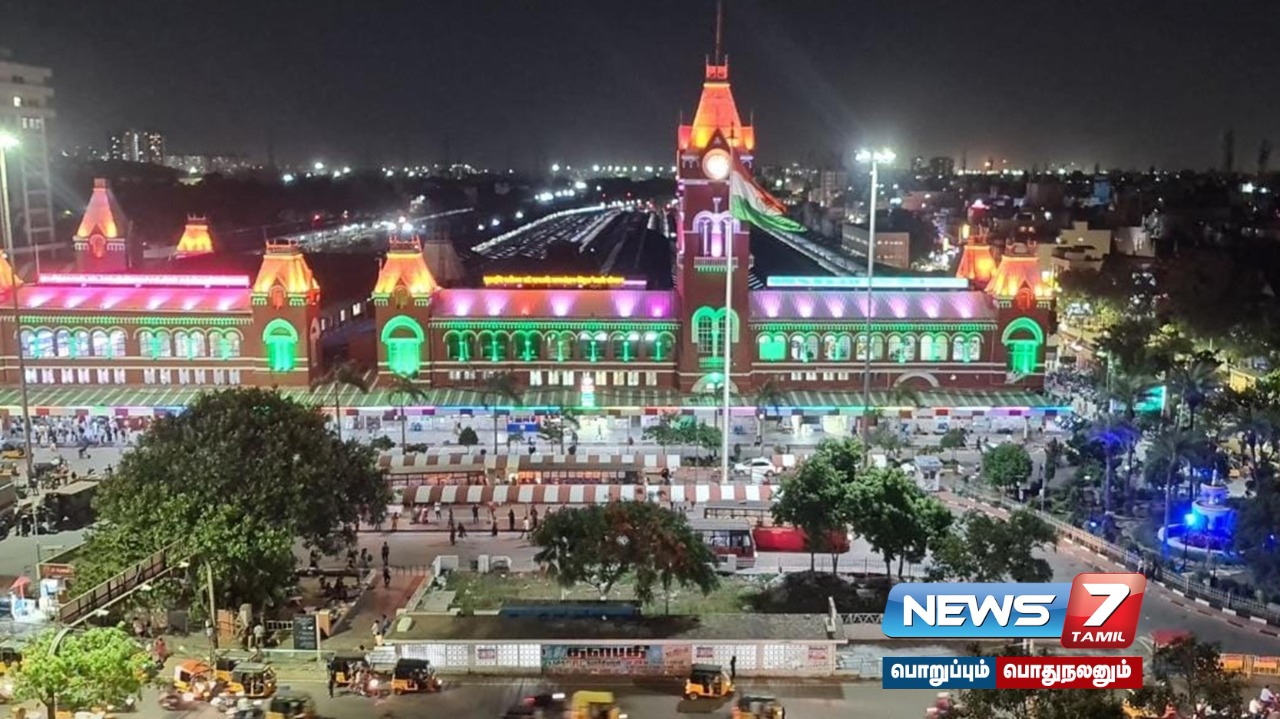 சென்னையில் நாளை முதலமைச்சர் மு.க.ஸ்டாலின் பங்கேற்கும் சுதந்திர தினவிழா நடைபெற உள்ள புனித ஜார்ஜ் கோட்டை, பெருநகர சென்னை மாநகராட்சி அலுவலகம் அமைந்துள்ள ரிப்பன் மாளிகை, சென்னை புரட்சித் தலைவர் எம் ஜி ஆர் மத்திய ரயில் நிலையம், பொதுப்பணித்துறை அலுவலகம், எல் ஐ சி கட்டிடம் உள்ளிட்ட பகுதிகள், மூவர்ண கொடி போர்தியது போல வண்ண விளக்குகளால் அலங்கரிக்கப்பட்டுள்ளன.