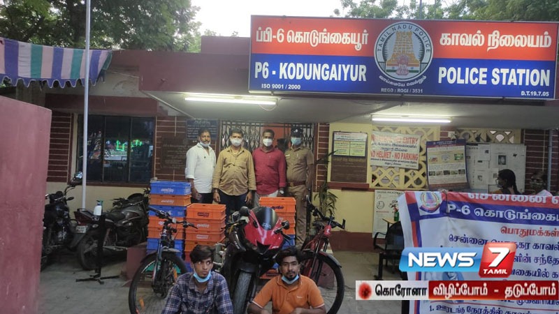 கொடுங்கையூர் பகுதியில் சைக்கிளில் வந்து பால் பாக்கெட்டுகளை திருடிய இரண்டு பேரை காவல்துறையினர் கைது செய்தனர்.
