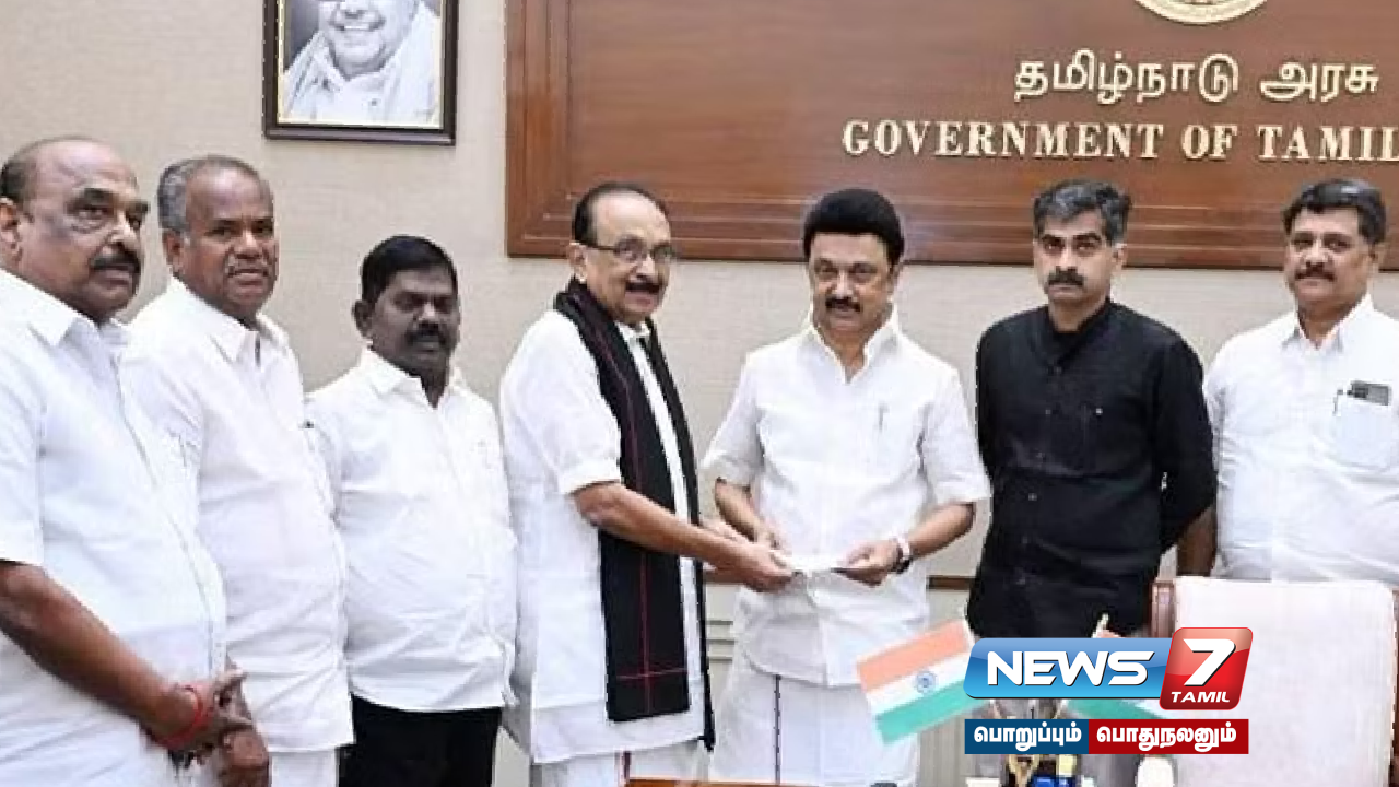 சென்னை தலைமைச் செயலகத்தில் முதலமைச்சர் மு.க. ஸ்டாலினை, மதிமுக பொதுச்செயலர் வைகோ இன்று (டிச.11) நேரில் சந்தித்து இதற்கான காசோலையை வழங்கினார்.