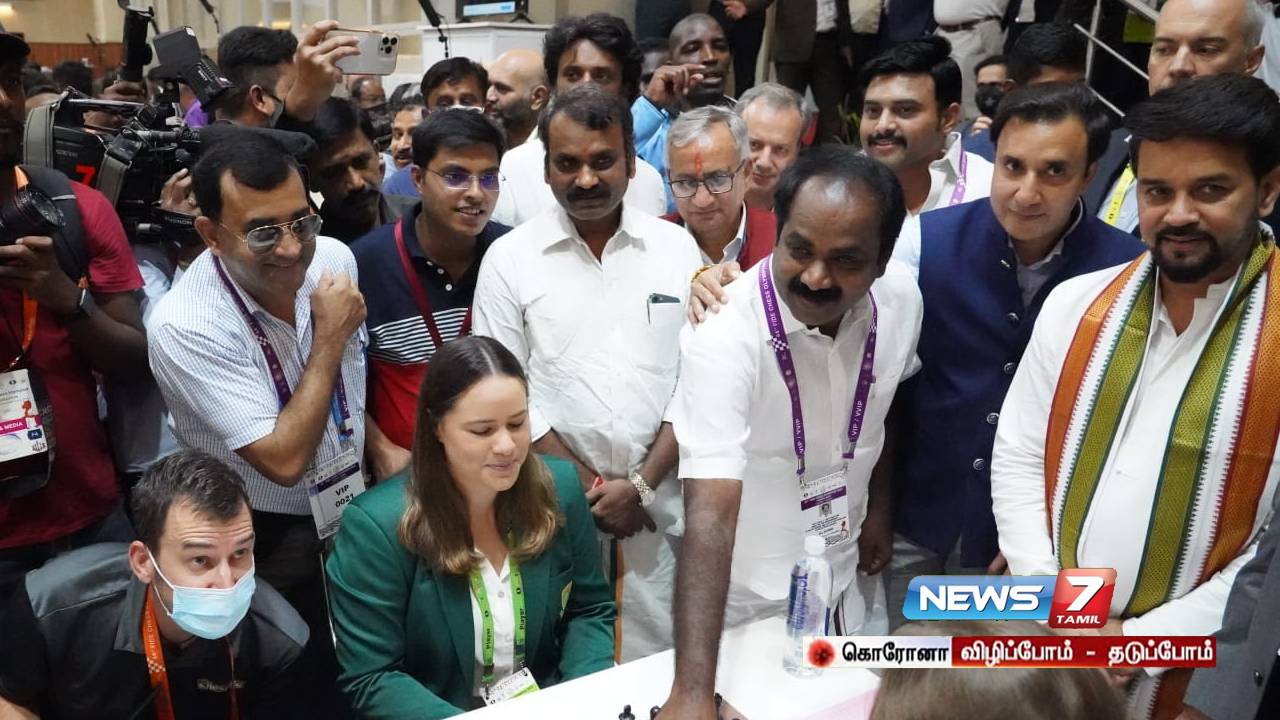 மத்திய விளையாட்டுத் துறை அமைச்சர் அனுராக் தாக்குருடன் தமிழக விளையாட்டு துறை அமைச்சர் மெய்யநாதன் மற்றும் சர்வதேச சதுரங்க சங்கத்தின் தலைவர் ஆர்க்காடி