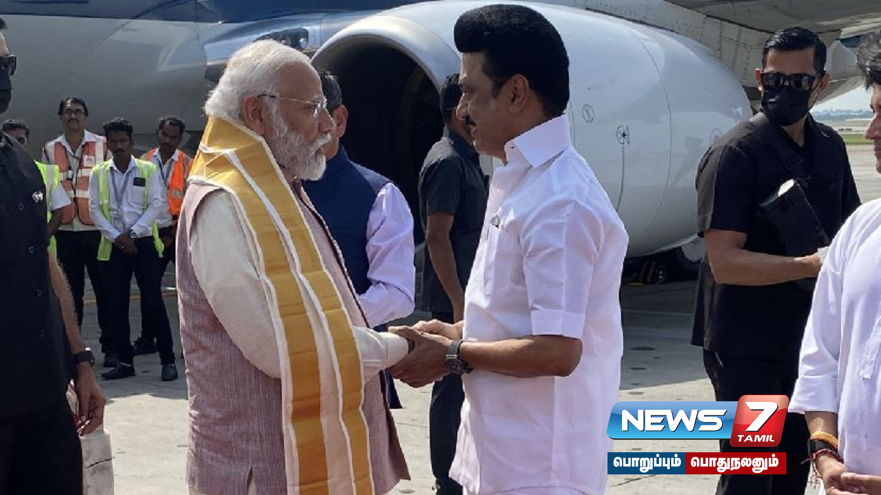 பிரதமர் நரேந்திர மோடி தமிழ்நாட்டுக்கு இரண்டு நாள் பயணமாக தனி விமான மூலம் இன்று பிற்பகல் சென்னை வந்தார். விமான நிலையத்தில் பிரதமர் நரேந்திர மோடியை தமிழ்நாடு ஆளுநர் ஆர்.என்,ரவி, முதலமைச்சர் மு.க.ஸ்டாலின், மத்திய அமைச்சர்கள் எல்.முருகன், ஜோதிராதித்ய சிந்தியா, அஷ்வினி வைஷ்ணவ், எதிர்க்கட்சித் தலைவர் எடப்பாடி பழனிசாமி உள்ளிட்டோர் வரவேற்றனர்.
