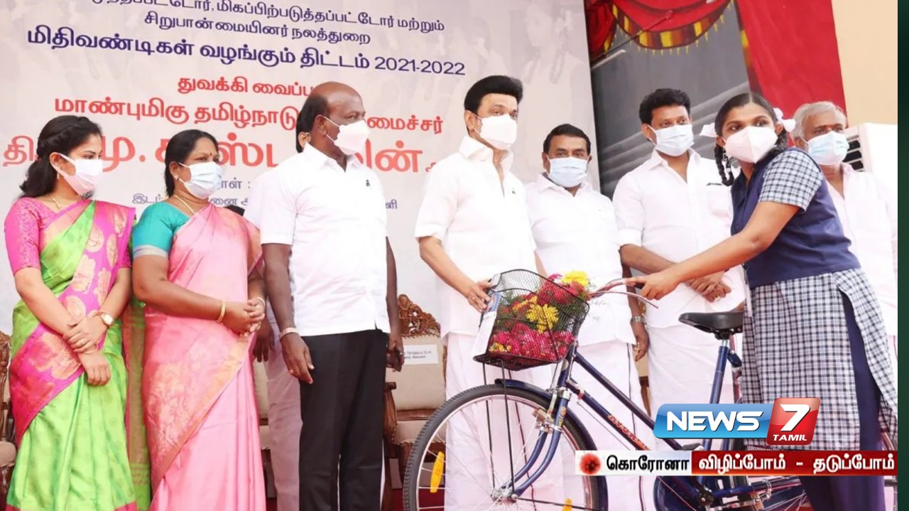 2021-2022ஆம் கல்வியாண்டில் பிளஸ் 1 பயின்ற மாணவ மாணவிகளுக்கு மிதிவண்டி வழங்கும் திட்டத்தை முதலமைச்சர் மு.க.ஸ்டாலின் இன்று தொடங்கி வைத்தார். இந்த மிதிவண்டிகளில் முதலமைச்சர் படம் பொறிக்கப்படாமல், சுற்றுசூழல் விழிப்புணர்வு குறித்த வாசகங்கள் மட்டுமே இடம்பெற்றுள்ளன.