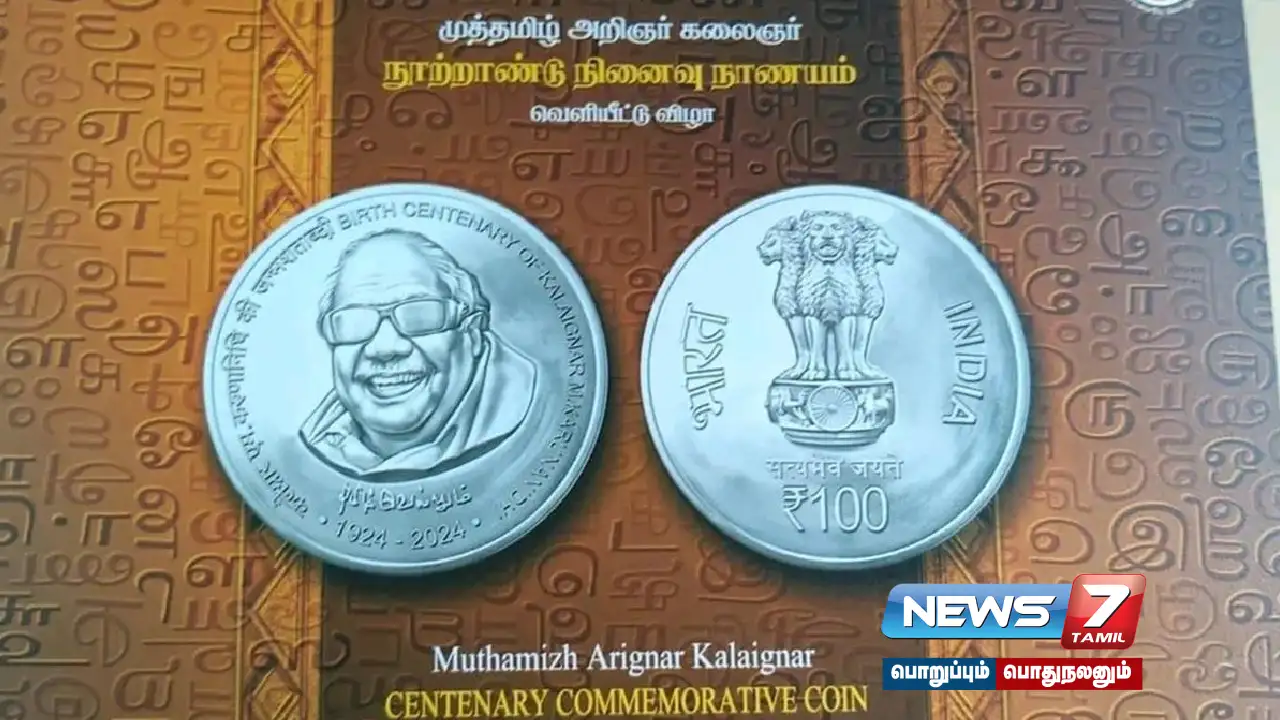 மறைந்த முன்னாள் முதலமைச்சர் கருணாநிதியின் நூற்றாண்டு நிறைவை முன்னிட்டு, அவரது உருவம் பொறித்த 100 ரூபாய் நாணயம் மத்திய அரசால் வெளியிடப்பட்டது. இந்த நாணயத்தை சென்னை கலைவாணர் அரங்கில், முதலமைச்சர் மு.க.ஸ்டாலின் தலைமையில் நாளை (ஆக.18) நடைபெறும் விழாவில், மத்திய பாதுகாப்புத் துறை அமைச்சர் ராஜ்நாத் சிங் வெளியிடுகிறார்.