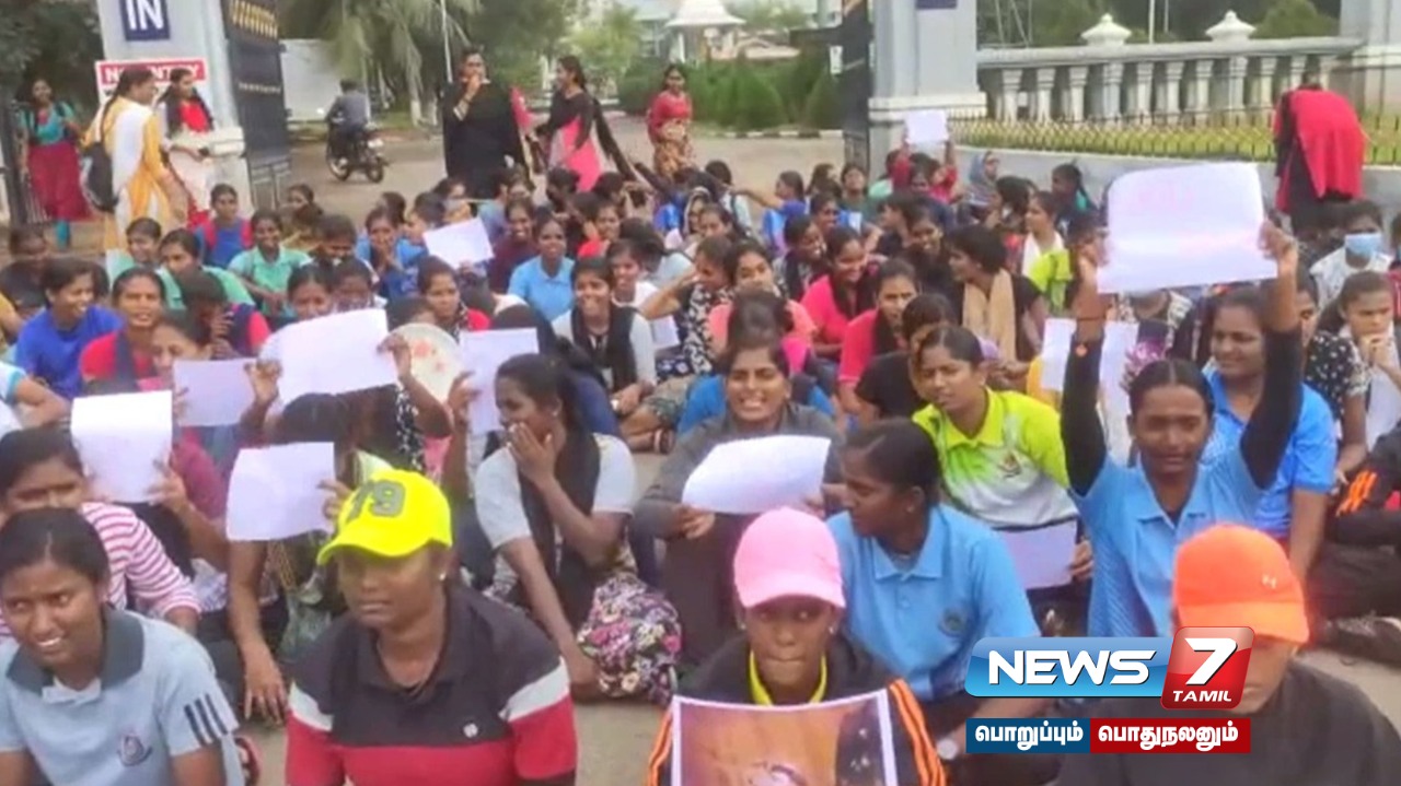 அதற்கு கல்லூரி நிர்வாகம் எந்த நடவடிக்கையும் எடுக்காததால், இன்று திடீரென பல்கலைக்கழகத்தின் வாயில் முன் அமர்ந்து போராட்டத்தில் ஈடுபட்டனர். இந்த போராட்டத்தில் கைகளில் தட்டு மற்றும் வாளிகளுடன் தரமற்ற உணவுகளின் புகைப்படத்தை கைகளில் ஏந்திய மாணவிகள் பல்கலைகழக நிர்வாகத்திற்கு எதிராக கோஷங்களை எழுப்பினர். மேலும் சரிவர தண்ணீர் மற்றும் உணவு வழங்க வேண்டும் எனவும் கோரிக்கை விடுத்துள்ளனர்.