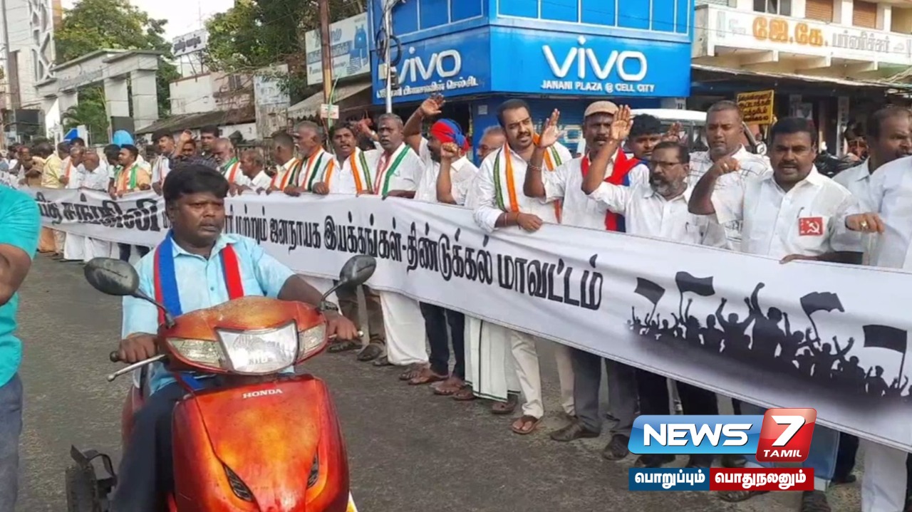 திண்டுக்கல் மாவட்டத்தில் மதச்சார்பற்ற இடதுசாரிகள் மற்றும் ஜனநாயக அமைப்புகள் சார்பாக திண்டுக்கல், நிலக்கோட்டை, பழனி மற்றும் கொடைக்கானல் ஆகிய நான்கு இடங்களில் மனித சங்கிலி போராட்டம் நடைபெற்றது. திண்டுக்கல்லில் நடைபெற்ற மனித சங்கிலி போராட்டத்தில் மார்க்சிஸ்ட் கம்யூனிஸ்ட் கட்சி , இந்திய கம்யூனிஸ்ட் கட்சி, விடுதலை சிறுத்தைகள் கட்சி, காங்கிரஸ் , மதிமுக, தமிழ்நாடு முஸ்லிம் முன்னேற்ற கழகம், எஸ்டிபிஐ உள்ளிட்ட 50க்கும் மேற்பட்ட மதச்சார்பற்ற இடதுசாரிகள் மற்றும் ஜனநாயக அமைப்புகளைச் சேர்ந்த 500க்கும் மேற்பட்டோர் மனித சங்கிலி போராட்டத்தில் ஈடுபட்டனர்.