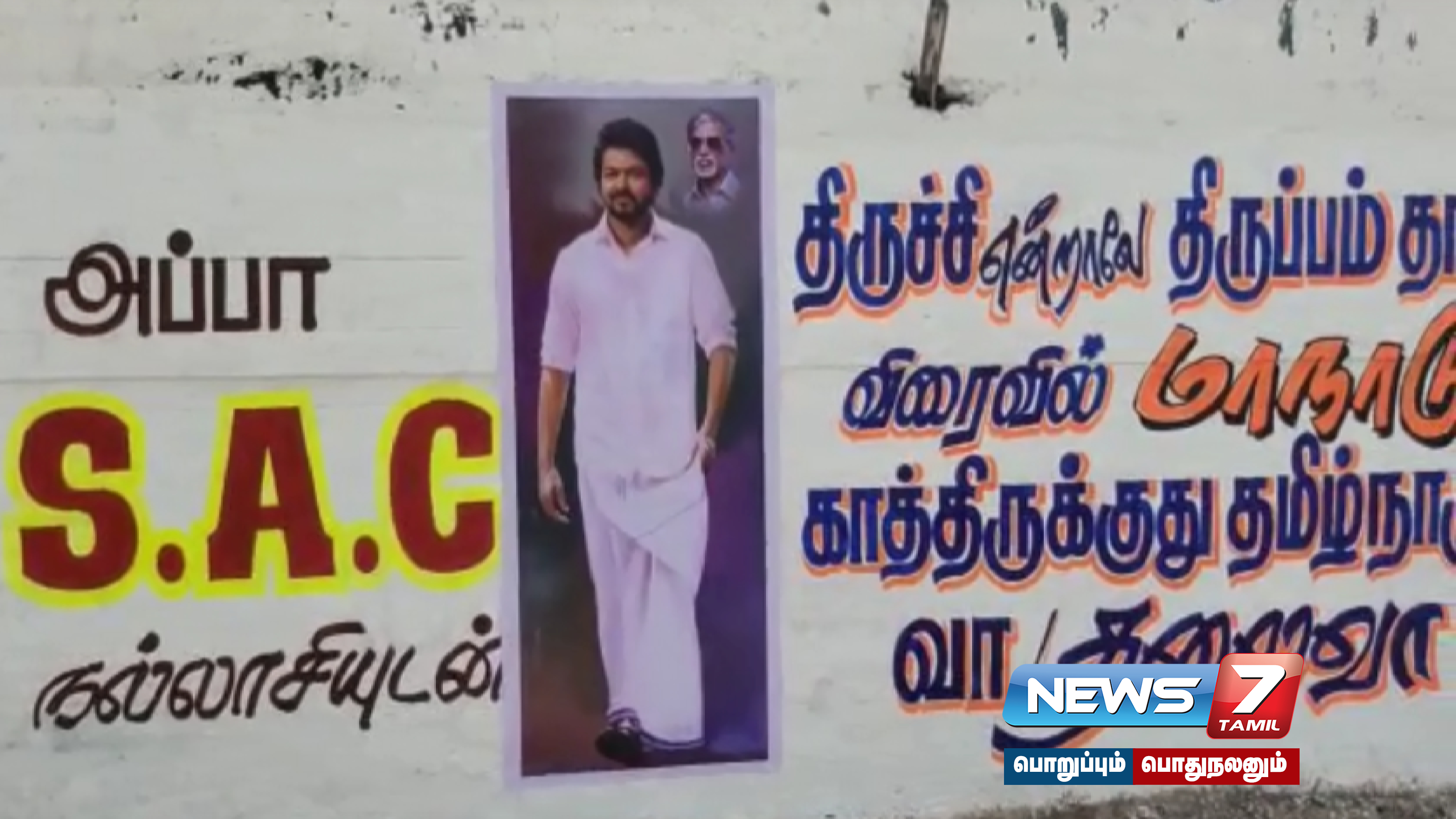 அந்த வகையில், நடிகர் விஜய் பிறந்தநாளையொட்டி, அரசியல் திருப்பு முனைகளுக்கு பெயர் பெற்ற திருச்சியில், அடுத்த மாதம் மாநாடு நடத்த அவரது ரசிகர்கள் திட்டமிட்டுள்ளனர். அதனை உறுதிப்படுத்தும் வகையில், திருச்சி மாவட்ட விஜய் ரசிகர் மன்றங்கள் சார்பாக ஆங்காங்கே சுவர் விளம்பரங்களை எழுதியுள்ளனர். அதில் திருச்சி என்றாலே திருப்பம் தான்..விரைவில் மாநாடு… காத்திருக்குது தமிழ்நாடு… வா தலைவா என்று விஜய்யை ரசிகர்கள் அழைக்கும் விதமாக இந்த விளம்பரங்கள் இடம் பெற்றுள்ளன.