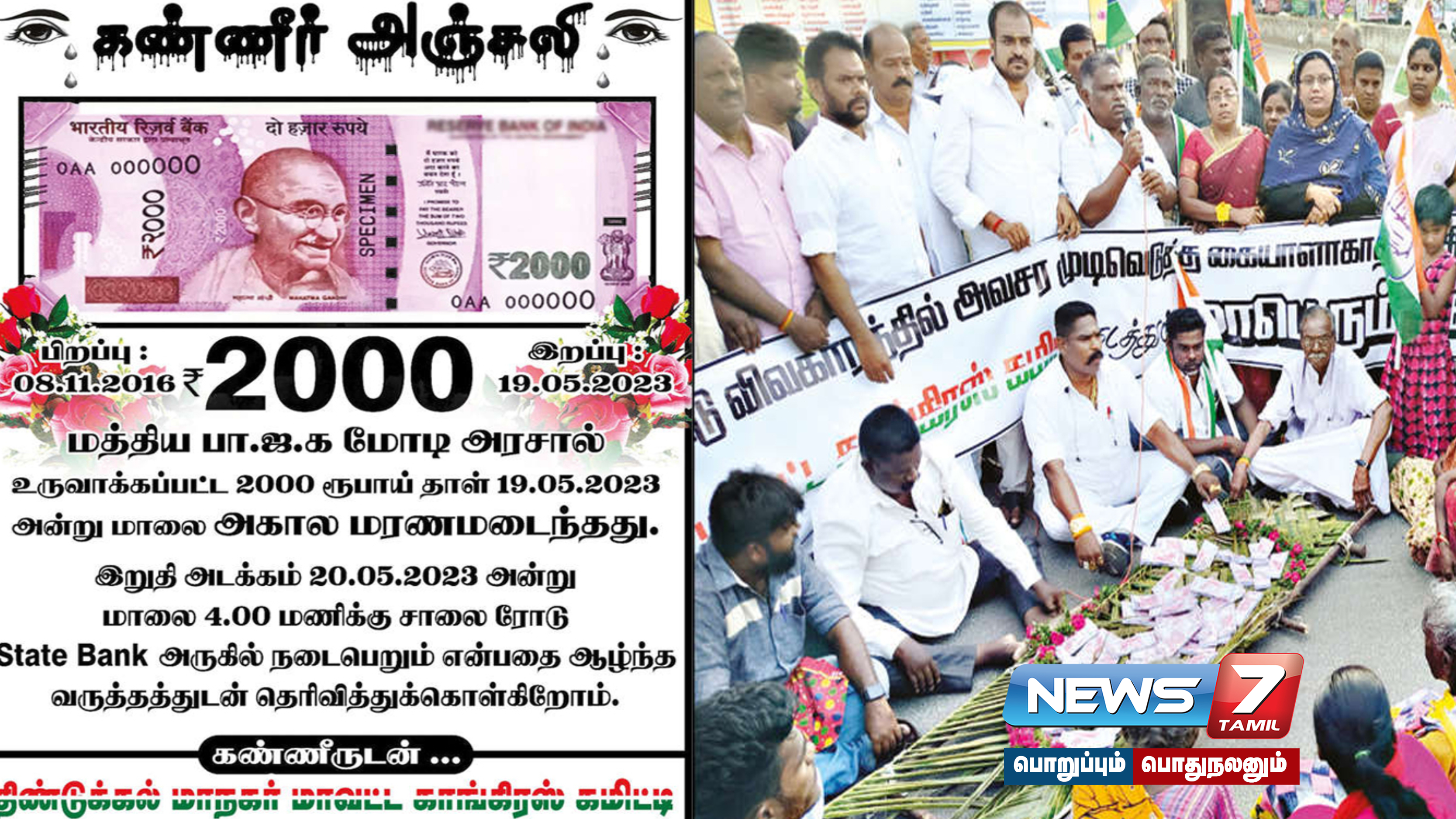 நோட்டுகளை திரும்பப் பெறப்படுவதாக ரிசர்வ் வங்கி அறிவித்துள்ள நிலையில், திண்டுக்கல்லில் 2000 ரூபாய் நோட்டிற்கு காங்கிரஸ் கட்சியினர் கண்ணீர் அஞ்சலி போஸ்டர் ஒட்டியது பரபரப்பு ஏற்படுத்தி உள்ளது.
