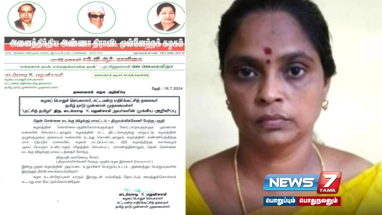 பகுஜன் சமாஜ் கட்சி மாநிலத் தலைவர் ஆம்ஸ்ட்ராங் கொலை வழக்கில் கைது செய்யப்பட்ட அதிமுக சென்னை திருவல்லிக்கேணி பகுதி இணைச் செயலாளர் மலர்கொடியை கட்சியில் இருந்து நீக்கி எடப்பாடி பழனிசாமி உத்தரவிட்டுள்ளார்.