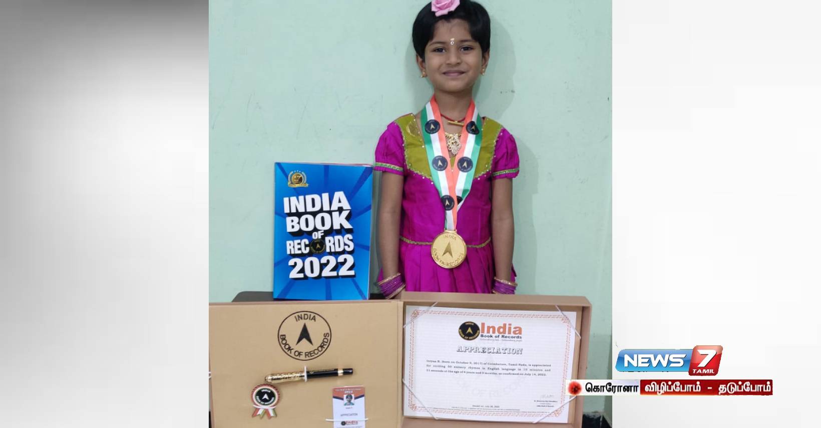 மாநகராட்சிப் பள்ளியில் படிக்கும் இனியா, 10 நிமிடங்களில் குழந்தைகளுக்கான 50 பாடல்களைப் பாடி இந்தியா புக் ஆஃப் ரெக்கார்ட்ஸ் சாதனை புத்தகத்தில் இடம்பெற்றுள்ளது கோவை மக்களை மட்டுமல்ல, நியூஸ் 7 தமிழ் குடும்பத்தையும் பெருமை கொள்ளச் செய்திருக்கிறது! மேலும் பல சாதனைகள் படைக்க வாழ்த்துகள் இனியா!