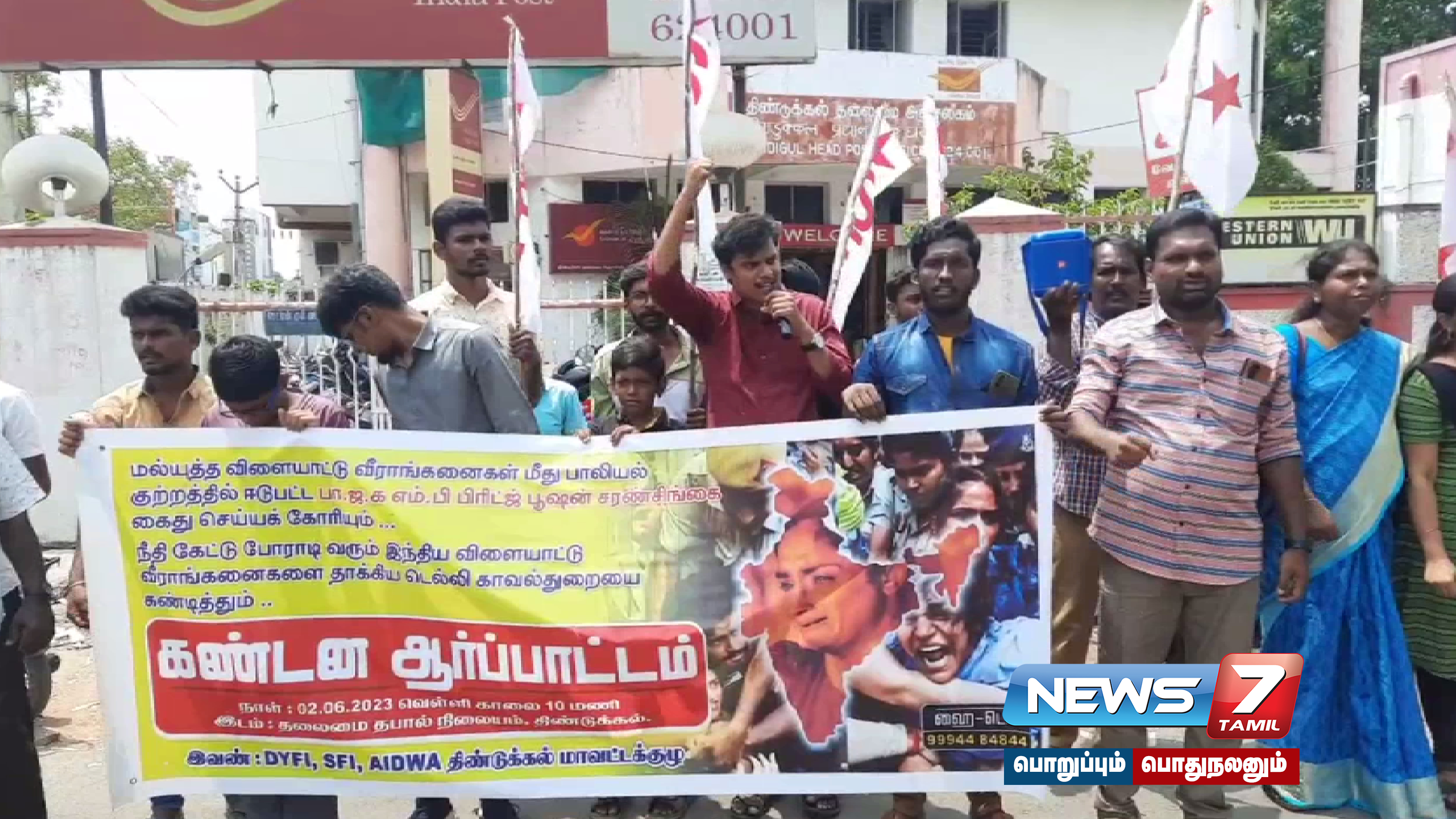 பாலியல் குற்றத்தில் ஈடுபட்டதாக மல்யுத்த வீராங்கனைகள் குற்றம்சாட்டிய பாஜக எம் பி- யை கைது செய்யக்கோரி திண்டுக்கல்லில் ஆர்ப்பாட்டம் நடைபெற்றது.