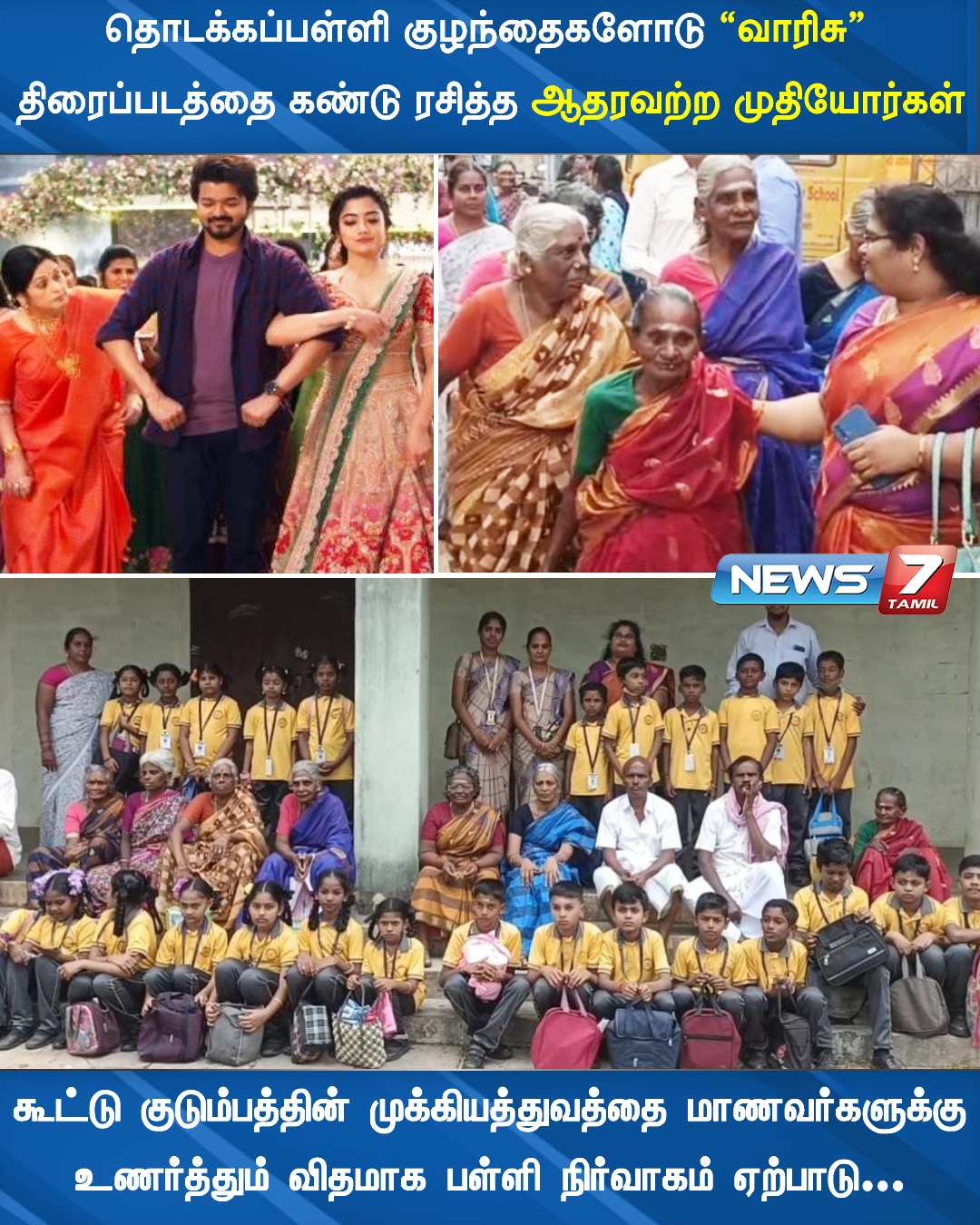 மயிலாடுதுறையில் தனியார் தொடக்கப்பள்ளி நிர்வாகத்தினர் ஆதரவற்ற முதியோர்களுடன் பள்ளி மாணவர்களை அழைத்து வந்து குடும்ப திரைப்படமான “வாரிசு” திரைப்படத்தைக் கண்டு ரசித்தனர்.