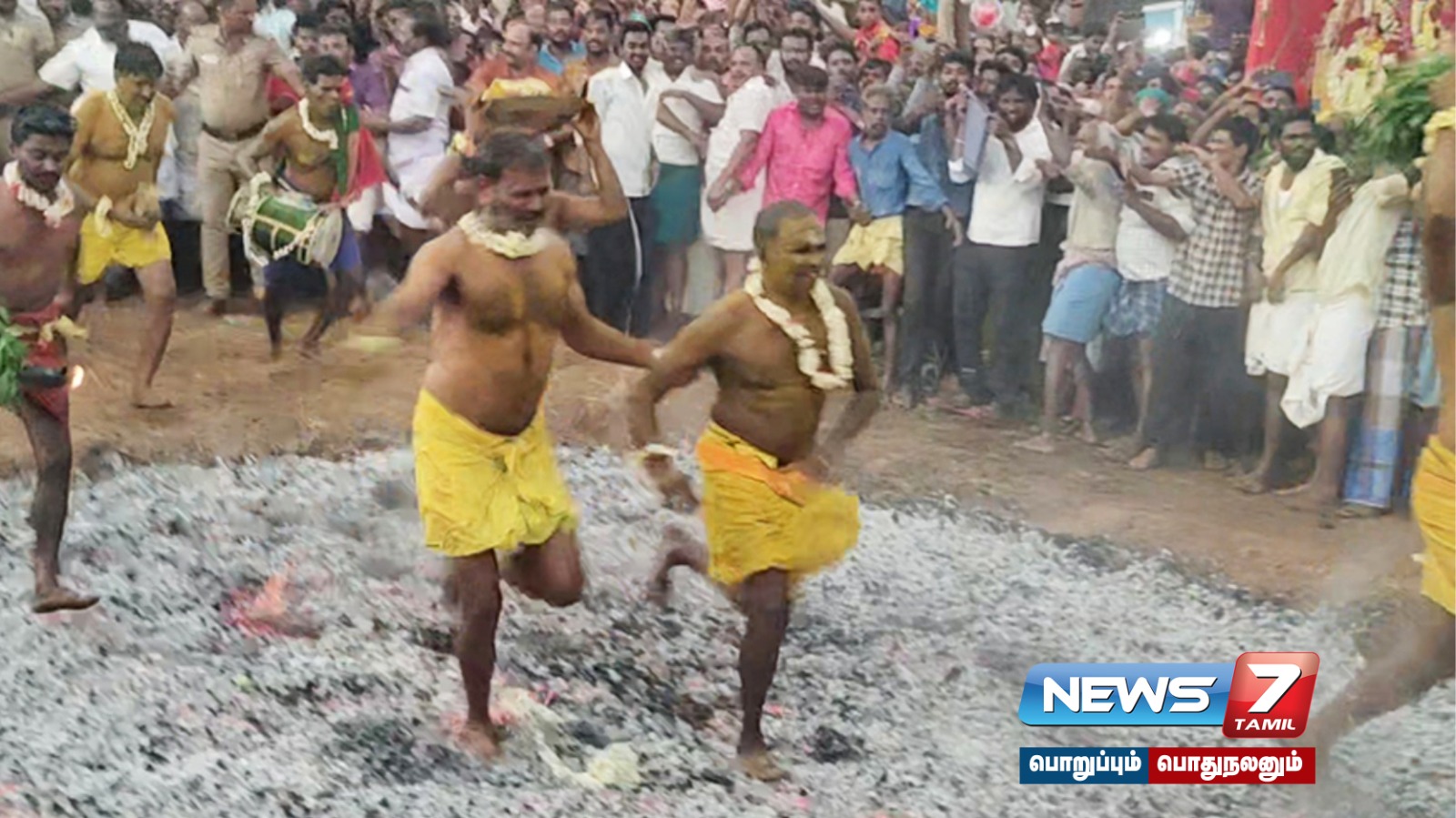 மதுரை மாவட்டம், சோழவந்தான் திரௌபதி அம்மன் கோயில் திருவிழாவையொட்டி, ஏராளமான பக்தர்கள் பூக்குழி இறங்கினர்.