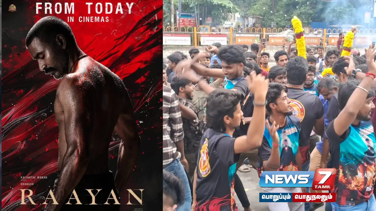 நடிகர் தனுஷின் 50வது திரைப்படமான ‘ராயன்’ இன்று வெளியாகியுள்ள நிலையில், திரையரங்கில் ரசிகர்கள் கொண்டாடி வருகின்றனர்.