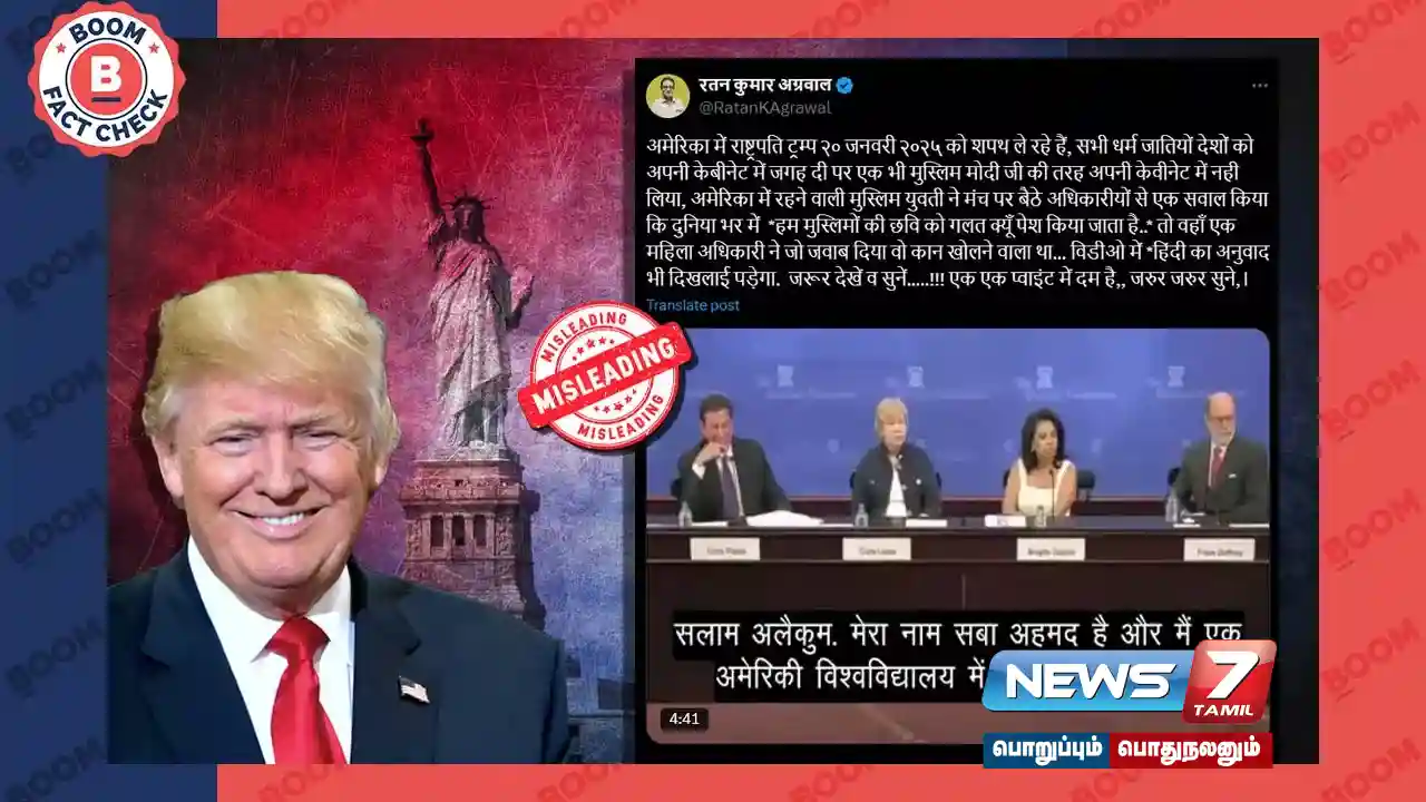 அமெரிக்காவைச் சேர்ந்த மாணவி ஒருவர், உலகெங்கிலும் உள்ள இஸ்லாம் குறித்த எதிர்மறையான சித்தரிப்பு குறித்து ஒரு குழுவிடம் கேள்வி எழுப்புகிறார். இந்த பழைய வீடியோ, அமெரிக்க அதிபராக தேர்ந்தெடுக்கப்பட்ட டொனால்ட் டிரம்பின் அமைச்சரவையில் முஸ்லிம் பிரதிநிதித்துவம் குறித்து கேள்வி எழுப்பியதாக தவறான கூற்றுடன் வெளியாகியுள்ளது. அமெரிக்க தேர்தலில் வெற்றி பெற்ற டொனால்ட் டிரம்ப் 2025 ஜனவரியில் வெள்ளை மாளிகையில் பொறுப்பேற்க உள்ளார். அமெரிக்க நாடாளுமன்றத்தின் மேலவையான செனட்டின் ஆலோசனை மற்றும் ஒப்புதலுடன் அவர்களுடன் பரிந்துரைக்கப்பட்ட அமைச்சரவை வேட்பாளர்களை அவர் ஏற்கனவே அறிவித்துள்ளார்.