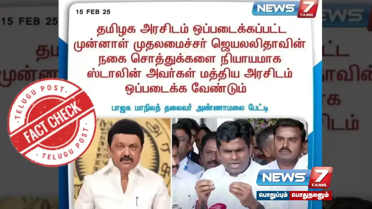 மேற்கொண்ட தணிக்கையின் முடிவில், மறைந்த முதலமைச்சர் ஜெயலலிதா சொத்துக்களை தமிழ்நாடு அரசு, மத்திய அரசிடம் ஒப்படைக்க வேண்டும் என பாஜக மாநிலத் தலைவர் அண்ணாமலை பேட்டி என்று பரவும் ‘நியூஸ் 7 தமிழ்’ செய்தி கார்டு போலியானது எனக் கண்டுபிடிக்கப்பட்டது. எனவே, செய்திகளை பகுப்பாய்வு செய்த பின் பகிரும் படி TeluguPost உண்மை கண்டறியும் குழு இதன் வாயிலாக கேட்டுக்கொள்கிறது.
