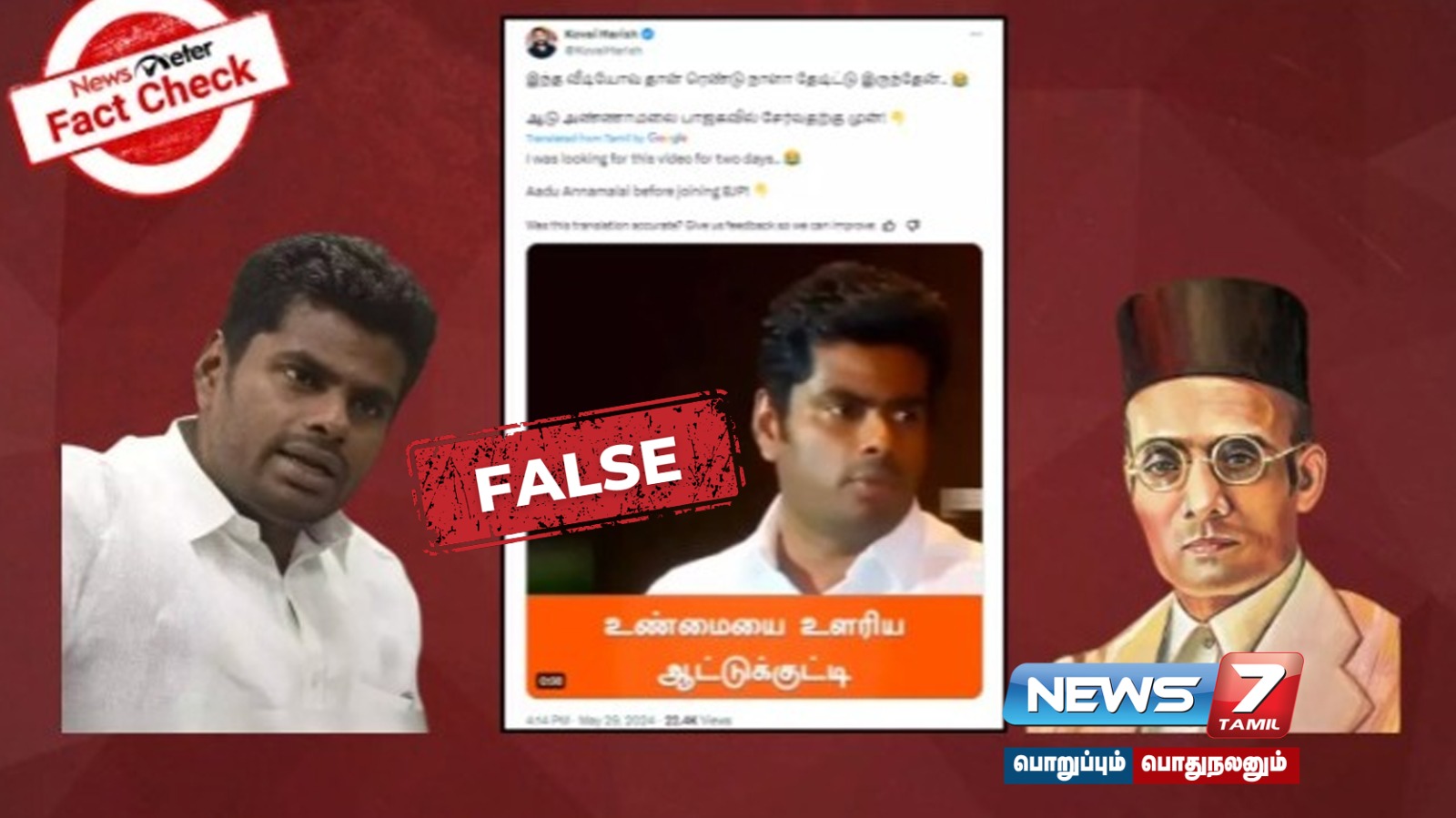 தமிழ்நாடு பாஜக தலைவர் அண்ணாமலை சாவர்க்கர் குறித்து விமர்சனம் செய்து பேசியதாக சமூக வலைதளங்களில் வீடியோ ஒன்று வைரலானது. இதன் உண்மைத் தன்மை குறித்து நியூஸ் மீட்டர் செய்தி நிறுவனம் ஆய்வுக்கு உட்படுத்தியது. இது குறித்து விரிவாக காணலாம்.