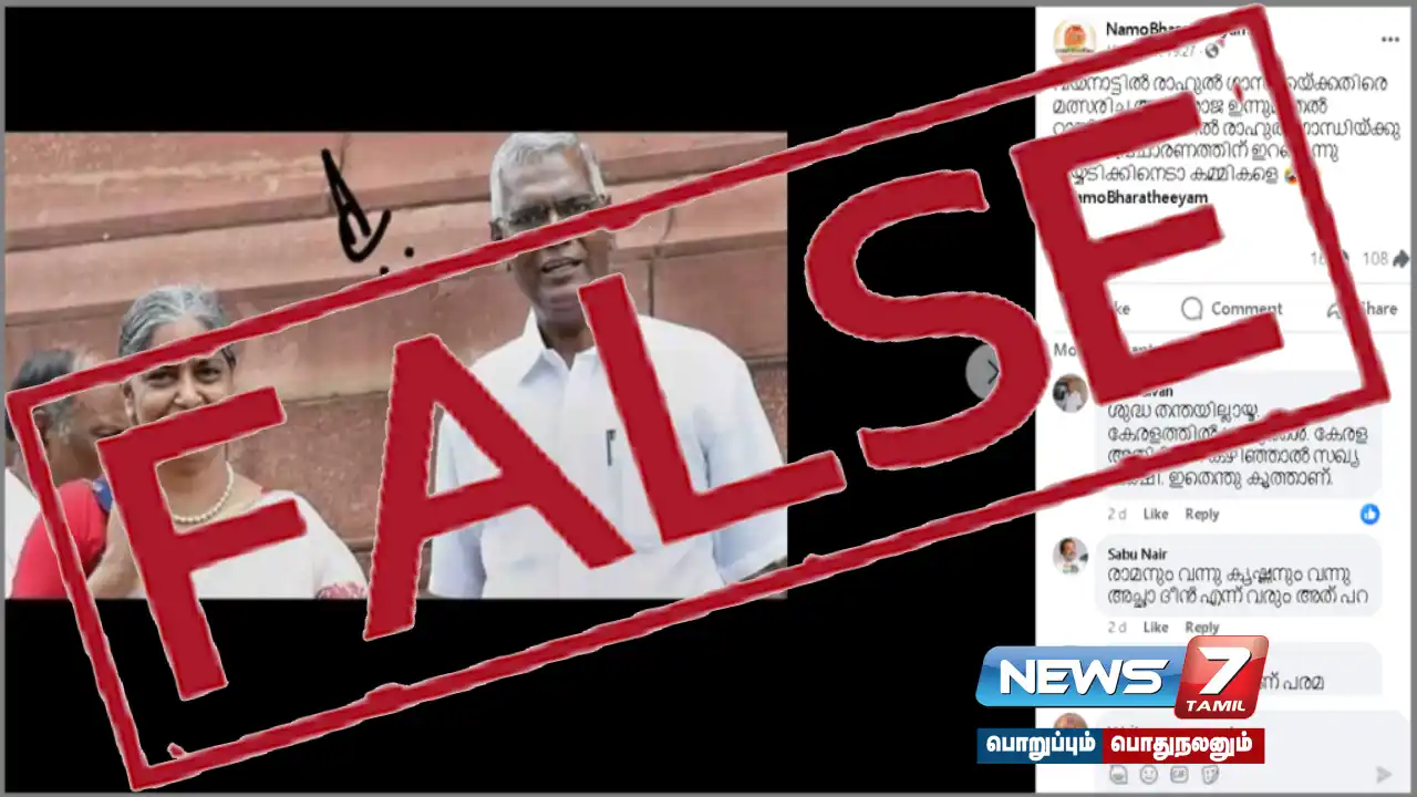 அந்த பதிவில், ஆனி ராஜாவும் அவரது கணவரும், இந்திய கம்யூனிஸ்ட் கட்சியின் பொதுச் செயலாளருமான டி.ராஜாவும் இருக்கும் புகைப்படத்தை பகிர்ந்து, “வயநாட்டில் ராகுலை எதிர்த்து போட்டியிட்ட ஆனி ராஜா, ரேபரேலியில் ராகுல் காந்திக்கு ஆதரவாக பிரசாரம் செய்கிறார்” என தலைப்பிடப்பட்டிருந்தது. ஆனால் Fact Crescendo விசாரணையில் இது முற்றிலும் பொய் என்று கண்டறியப்பட்டது.