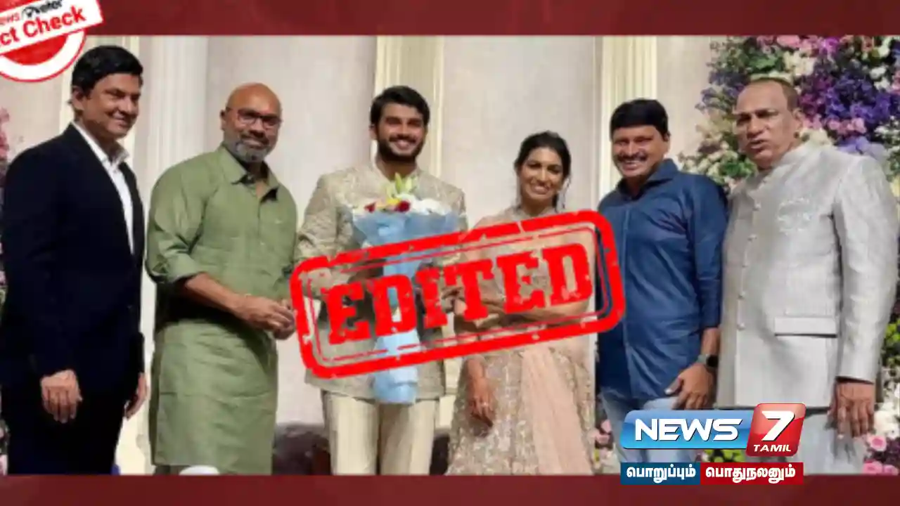 திருமண வரவேற்பில் தெலங்கானா பாஜகவின் முக்கியத் தலைவர்களில் ஒருவரான அரவிந்த் தருமபுரியும், பாரதிய ராஷ்ட்ரிய சமிதி கட்சியின் சந்தோஷ் குமாரும் ஒன்றாக மேடையை பகிர்ந்து கொண்டதாக பரவும் படம் போலியானது என்றும் எடிட் செய்யப்பட்டது என்றும் நிரூபனமாகிறது.