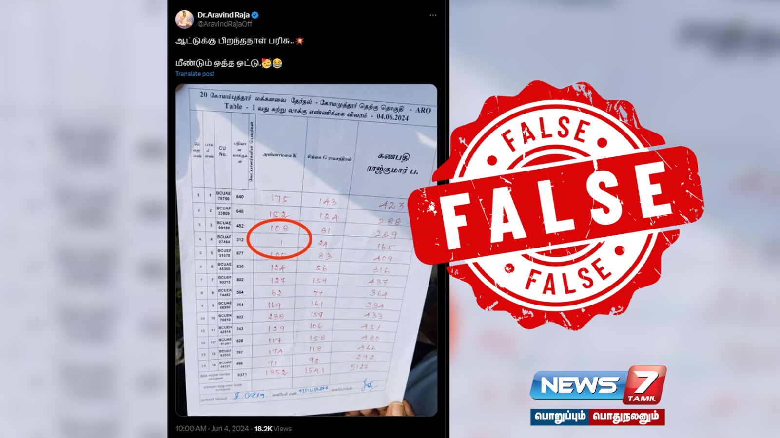 கோயம்புத்தூரில் உள்ள பூத் ஒன்றில் பாஜக மாநிலத் தலைவரான அண்ணாமலை ஒரே ஒரு ஓட்டு மட்டுமே வாங்கினார் என சமூக வலைதளங்களில் ஒரு பட்டியல் வைரலாகி வருகிறது. இந்த செய்தியின் உண்மை குறித்து நியூஸ் செக்கர் ஆய்வுக்கு உட்படுத்தியது. இது குறித்து விரிவாக காணலாம்.