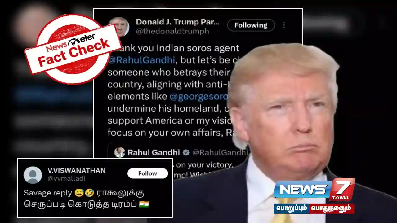 ராகுல் காந்தியை அமெரிக்காவின் புதிய அதிபரான டொனால்ட் ட்ரம்ப் சோரோஸ் ஏஜெண்ட் என விமர்சனம் செய்ததாக சமூக வலைதளங்களின் பதிவு ஒன்று பரவி வரும் நிலையில் அது குறித்த உண்மைத் தன்மையை விரிவாக காணலாம்.