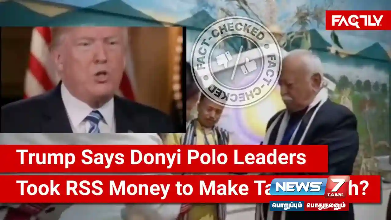 இந்த வீடியோவில்,டோனி போலோ (அருணாச்சலப் பிரதேசத்தில் உள்ள ஒரு பூர்வீக நம்பிக்கை) இனத்தின் தலைவர்களை கிறிஸ்தவர்களுக்கு எதிராகத் தூண்டுவதற்காக ஆர்.எஸ்.எஸ்ஸிடமிருந்து பணம் பெற்றதாக டிரம்ப் கூறுவதைக் அந்த வீடியோவில் கேட்கலாம். இந்த வீடியோ ‘… அருணாச்சலப் பிரதேசத்தின் டானி குலத்திற்கு மிகவும் ஆபத்தானது ‘ என்று எழுதப்பட்ட எச்சரிக்கை செய்தியாகப் பகிரப்படுகிறது. இந்தக் கட்டுரையின் மூலம் இந்தக் கூற்றை உண்மைச் சரிபார்ப்பு செய்யலாம்.