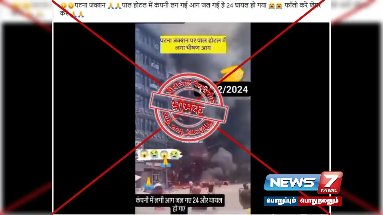 வைரலான வீடியோ ஏப்ரல் 2024 ல் உள்ளது. சமீப காலங்களில் பாட்னாவின் பால் ஹோட்டலில் இதுபோன்ற தீ விபத்து எதுவும் பதிவாகவில்லை. சுமார் 8 மாதங்கள் பழமையான ஒரு சம்பவத்தின் வீடியோவை சமீபத்தியது என்று தவறான கூற்றுடன் பயனர்கள் பகிர்கின்றனர்.