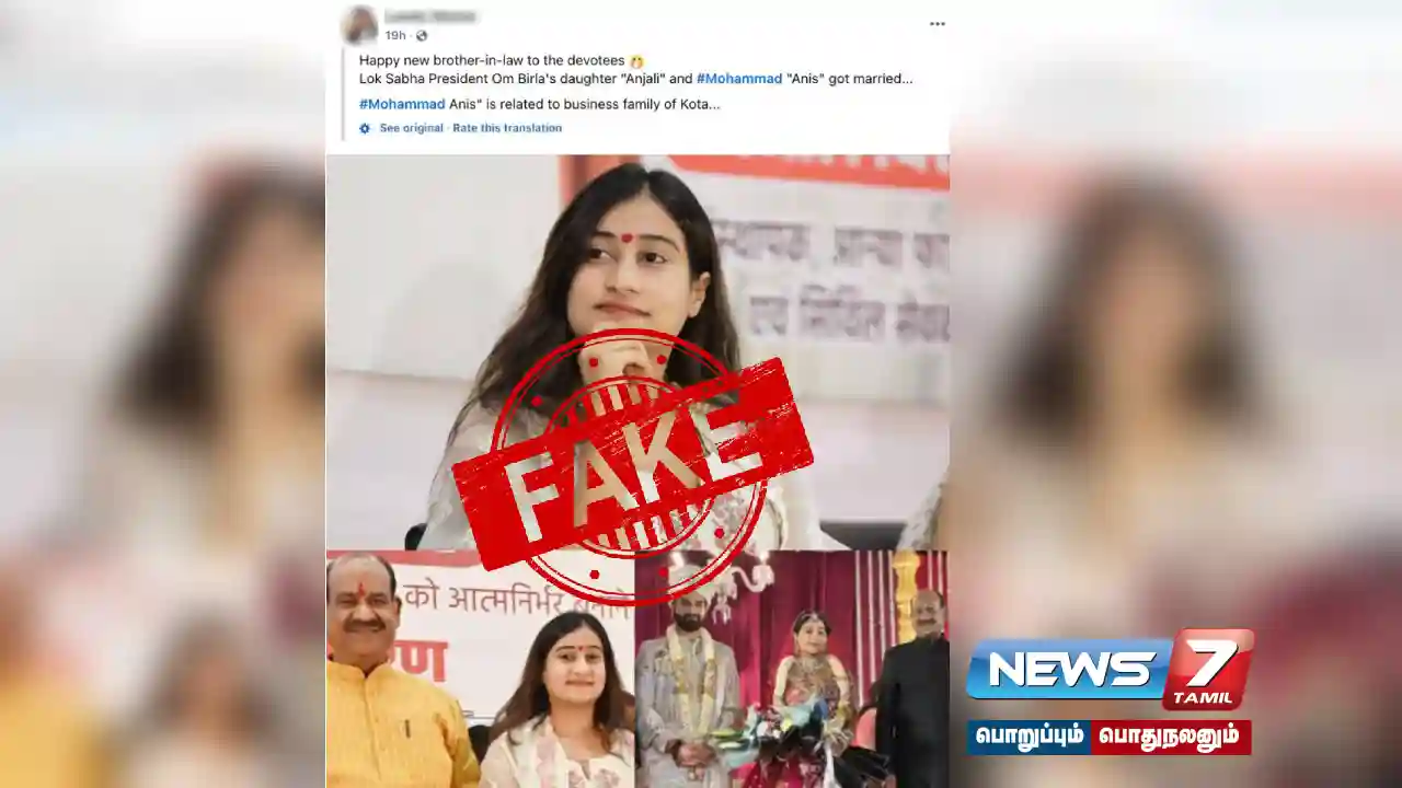ராஜஸ்தான் மாநிலம் கோட்டா தொகுதியின் எம்பியும் , மக்களவை சபாநாயகருமான ஓம் பிர்லாவின் மகள் குறித்த செய்திகள் சமூக வலைதளங்களில் பேசு பொருளாகியுள்ளன. ஓம் பிர்லாவின் மகளான அஞ்சலி பிர்லா ஒரு ஐ.ஏ.எஸ் அதிகாரி ஆவார். இவர் ராஜஸ்தான் மாநிலம் கோட்டாவை பூர்வீகமாக கொண்ட வணிகக் குடும்பத்தைச் சேர்ந்த முகமது அனிஷ் என்ற முஸ்லீம் இளைஞரை திருமணம் செய்தார் என மணந்தார் என சமூக வலைதளங்களில் . சமூக வலைதளங்களில் வைரலான பதிவுகளை பேக்ட்லி உண்மை சரிபார்ப்பு செய்தி நிறுவனம் ஆய்வுக்கு உட்படுத்தியது.