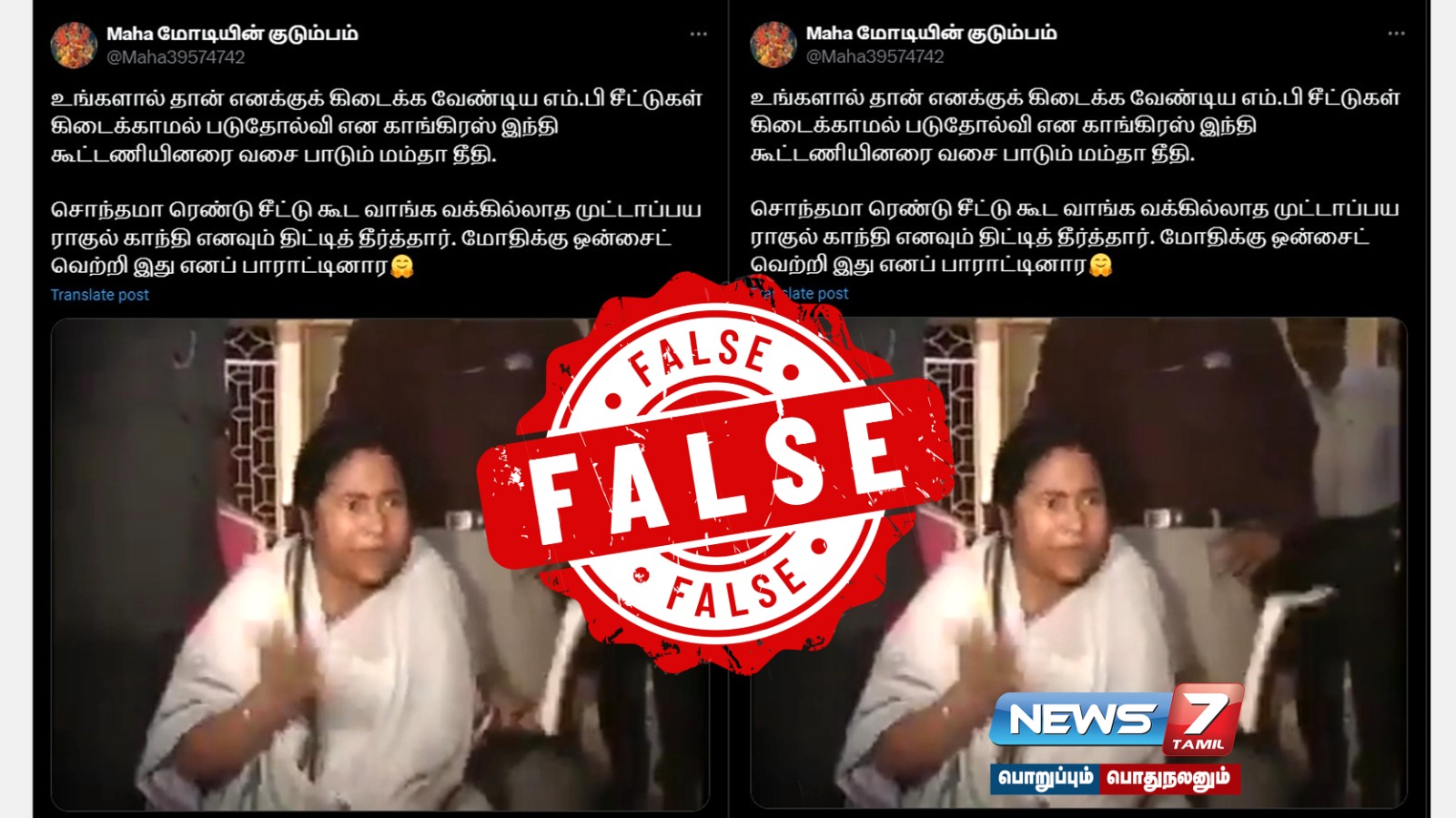 இந்த நிலையில் மேற்கு வங்க முதலமைச்சர் மம்தா பானர்ஜி பேசியதாக காணொலி ஒன்று சமூக வலைதளங்களில் வைரலாக பரவியது. ச “உங்களால் தான் எனக்குக் கிடைக்க வேண்டிய எம்.பி சீட்டுகள் கிடைக்காமல் படுதோல்வி என காங்கிரஸ் இந்தி கூட்டணியினரை வசை பாடும் மம்தா தீதி. சொந்தமா ரெண்டு சீட்டு கூட வாங்க வக்கில்லாத முட்டாப்பய ராகுல் காந்தி எனவும் திட்டித் தீர்த்தார். மோடிக்கு ஒன்சைட் வெற்றி இது எனப் பாராட்டினார்” என்கிற கேப்சனோடு அந்த வீடியோ பரவி வருகின்றது.