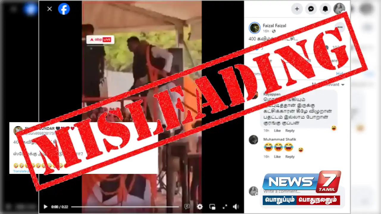 மோடி போன்று ஆடை அணிந்த நபர் ஒருவர் மேடை ஏறும் போது தவறி விழும் வீடியோ எக்ஸ் தளம், ஃபேஸ்புக் உள்ளிட்ட சமூக ஊடகங்களில் பகிரப்பட்டு வருகிறது. அந்த பதிவில், “400 கவிழ்ந்த காட்சி… ஸ்டேஜ்க்கு அடில தேடுறானோ?” என்று குறிப்பிடப்பட்டிருந்தது. இந்த வீடியோவை பலரும் சமூக ஊடகங்களில் பதிவிட்டு வருகின்றனர்.