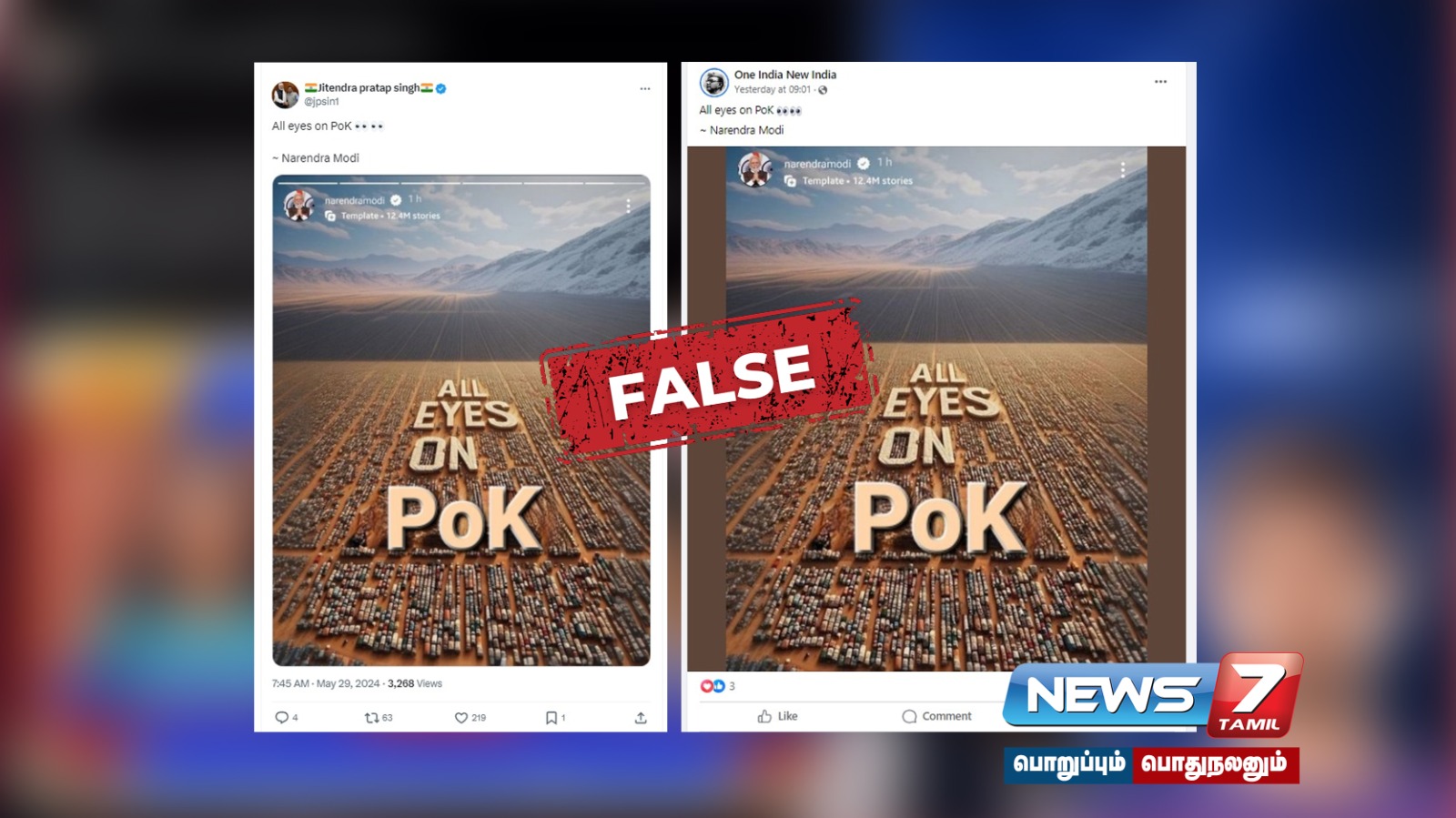 வைரலான படத்தைப் கூகுள் லென்ஸ் தேடலுக்கு உட்படுத்தியபோது பிரதமரின் இன்ஸ்டாகிராம் ஸ்டோரியின் ஸ்கிரீன் ஷாட்டைப் பலர் பகிர்ந்த பதிவுகள் மற்றும் மீம்கள் என பல இடுகைகளுக்கு அவை அழைத்துச் சென்றது. அதேபோல மே 28 அன்று இரவு 10:09 மணிக்குத்தான் All Eyes on PoK என்ற சொற்றொடர் ஒரு X பயனரின் பதிவில் முதன் முதலில் காணப்பட்டது . அந்த X பதிவின் கமெண்ட் செக்சனில் @Incognito_qfs இன் இடுகையில் மே 28 அன்று இரவு 10:33 மணிக்கு இப்படம் முதலில் பகிரப்பட்டதை நியூஸ் செக்கர் உறுதி செய்துள்ளது. மேலும் இதேபோல All Eyes on Thailand, All Eyes on June 4 போன்ற படங்களும் சில சமூக வலைதள பயனர்களால் இணையத்தில் பகிரப்பட்டது குறிப்பிடத்தக்கது.
