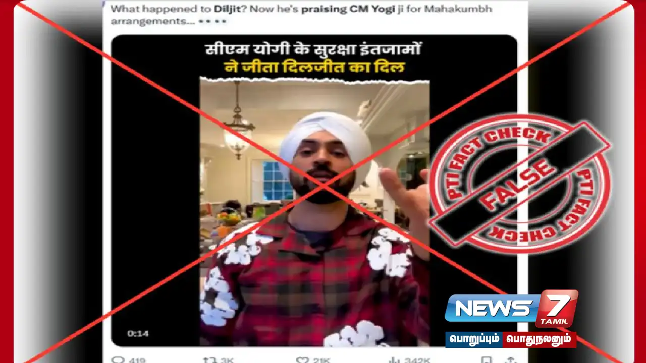 சமீபத்தில் சமூக ஊடகங்களில் ஒரு காணொலி வைரலானது. அதில் பிரபல இந்திய பாடகரும் நடிகருமான தில்ஜித் தோசன்ஜ், 2025 ஆண்டிற்கான மகா கும்பமேளா நிகழ்ச்சியை சிறப்பாக ஏற்பாடு செய்ததற்கு யோகி ஆதித்யநாத் தலைமையிலான உத்தரபிரதேச அரசை பாராட்டுவதாக அந்த வீடியோவில் தெரிவிக்கப்பட்டுள்ளது