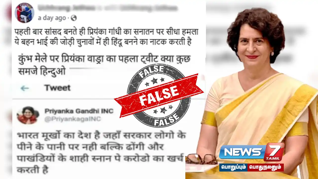 காங்கிரஸ் தலைவர் பிரியங்கா காந்தி வயநாடு எம்.பி.யான பிறகு கும்பமேளா குறித்து ட்வீட் செய்துள்ளதாக பதிவு ஒன்று வைரலாகி வருகிறது. இதுகுறித்த உண்மை சரிபார்ப்பை காணலாம்.