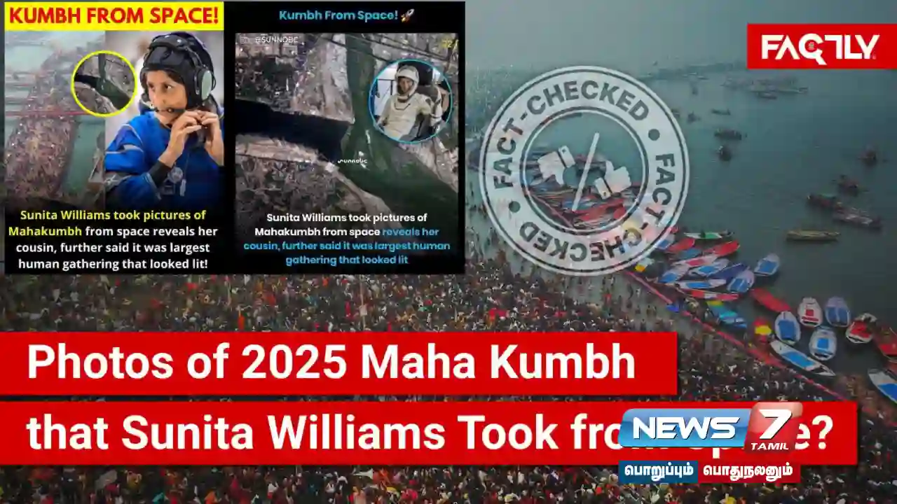 சர்வதேச விண்வெளி நிலையத்தில் (ISS) ஒன்பது மாதங்களுக்கும் மேலாக தங்கிய பிறகு, மார்ச் 18, 2025 அன்று நாசா விண்வெளி வீரர்களான சுனிதா வில்லியம்ஸ் உள்ளிட்டோர் பூமிக்கு திரும்பியபோது, இரண்டு புகைப்படங்கள் ( இங்கே , இங்கே , இங்கே , மற்றும் இங்கே ) சமூக ஊடகங்களில் பரவலாகப் பகிரப்பட்டன. இந்த புகைப்படங்கள் 2025 பிரயாக்ராஜ் மகா கும்பமேளாவைக் காட்டுவதாகக் கூறப்படுகின்றன, இதை சுனிதா வில்லியம்ஸ் விண்வெளியில் இருந்து படம்பிடித்ததாகக் கூறப்படுகிறது. இருப்பினும், பல பயனர்கள் கருத்துகளில் இந்த புகைப்படங்களின் நம்பகத்தன்மை குறித்து சந்தேகங்களை எழுப்பியுள்ளனர். இந்தக் கூற்றுக்களின் உண்மையை சரிபார்ப்போம்.