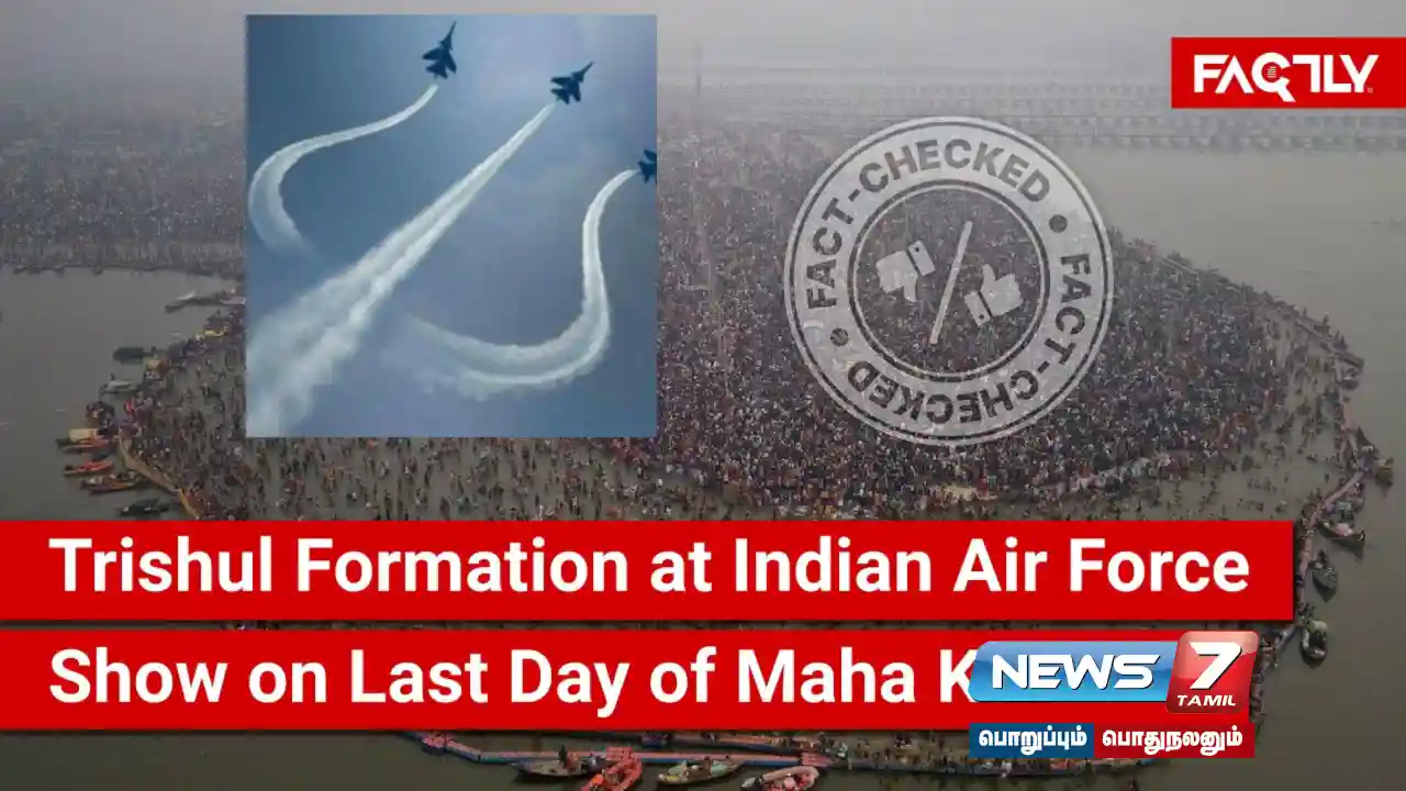 மகா கும்பமேளாவின் கடைசி நாளில், அதாவது பிப்ரவரி 26, 2025 அன்று பிரயாக்ராஜில் இந்திய விமானப்படையின் விமான கண்காட்சியின் போது எடுக்கப்பட்டதாகக் கூறப்படும் ஒரு புகைப்படம் சமூக ஊடகங்களில் வைரலாகி வருகிறது. 45 நாட்கள் நடந்த நிகழ்ச்சியை நினைவுகூரும் வகையில் இந்த விமான கண்காட்சி நடத்தப்பட்டதாகவும் பதிவுகளில் தெரிவிக்கப்பட்டது.