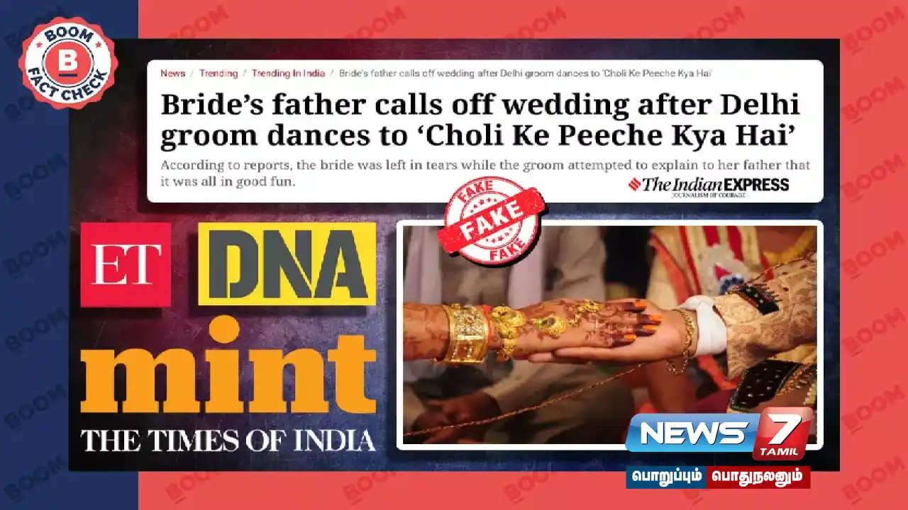 டெல்லியில் ஒரு திருமணத்தின்போது ‘ சோளி கே பீச்சே’ என்ற பாலிவுட் பாடலுக்கு மணமகன் நடனம் ஆடியதால் மணமகளின் தந்தை திருமணத்தை ரத்து செய்ததாகக் கூறும் செய்திகள் வைரலானது. அச்செய்தி குறித்து ஆய்வு செய்தபோது அவை போலியானது என்றும் அத்தகைய சம்பவம் எங்கும் பதிவாகவில்லை எனவும் தெரியவந்துள்ளது.